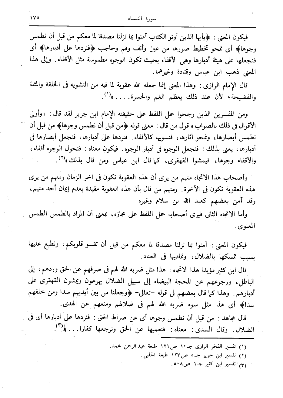 ومن المفسرين الذين رجحوا حمل اللفظ على حقيقته الإمام ابن جرير لقد قال: «وأولى الأقوال في ذلك بالصواب» قول من قال: معنى قوله مِنْ قَبْلِ أَنْ نَطْمِسَ وُجُوهاً من قبل أن نطمس أبصارها، ونمحو آثارها، فنسويها كالأقفاء. فنردها على أدبارها، فنجعل أبصارها في أدبارها، يعنى بذلك: فنجعل الوجوه في أدبار الوجوه. فيكون معناه: فنحول الوجوه أقفاء، والأقفاء وجوها، فيمشوا القهقرى، كما قال ابن عباس ومن قال بذلك» «2» .