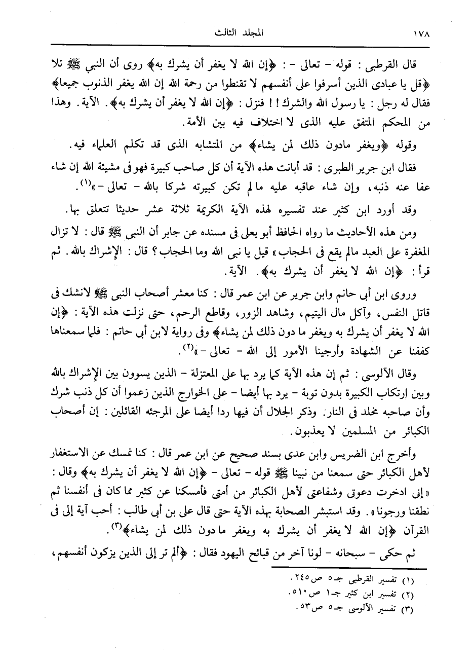 قال القرطبي: قوله- تعالى-: إِنَّ اللَّهَ لا يَغْفِرُ أَنْ يُشْرَكَ بِهِ روى أن النبي صلى الله عليه وسلم تلا قُلْ يا عِبادِيَ الَّذِينَ أَسْرَفُوا عَلى أَنْفُسِهِمْ لا تَقْنَطُوا مِنْ رَحْمَةِ اللَّهِ إِنَّ اللَّهَ يَغْفِرُ الذُّنُوبَ جَمِيعاً فقال له رجل: يا رسول الله والشرك!! فنزل: إِنَّ اللَّهَ لا يَغْفِرُ أَنْ يُشْرَكَ بِهِ. الآية. وهذا من المحكم المتفق عليه الذي لا اختلاف فيه بين الأمة.