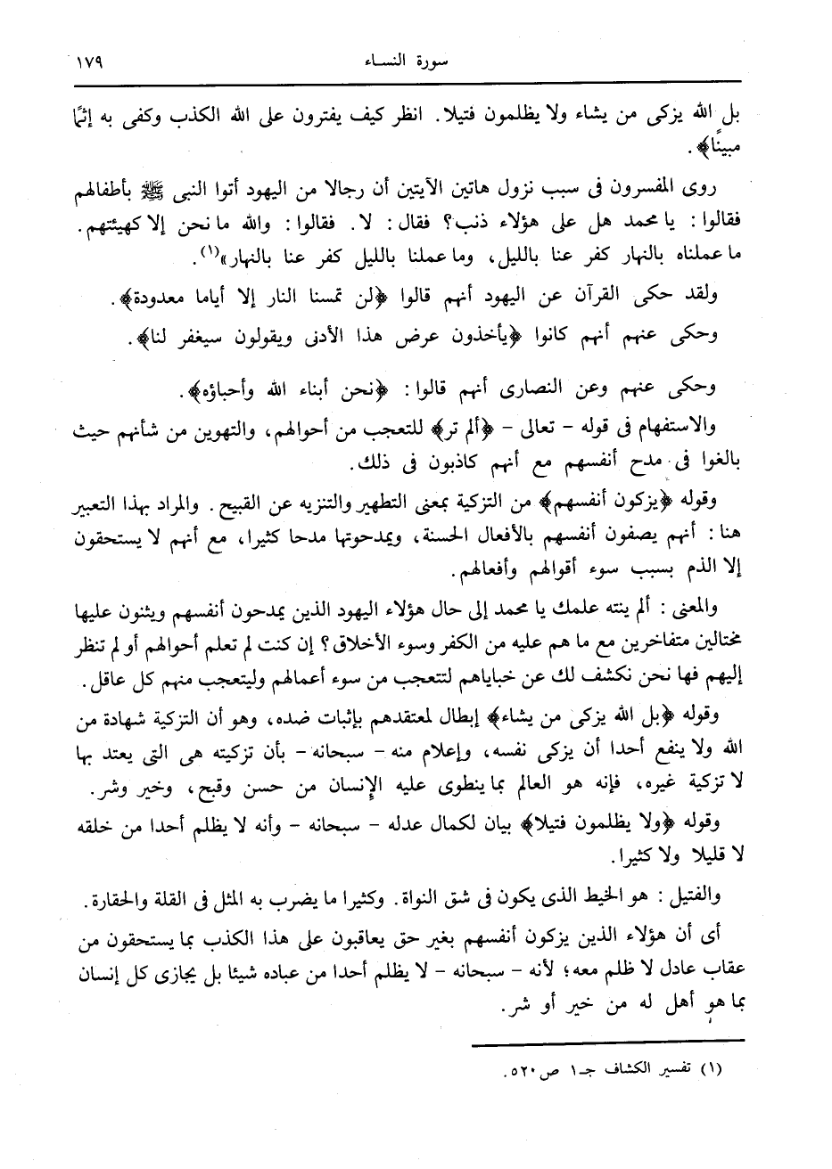 أَلَمْ تَرَ إِلَى الَّذِينَ يُزَكُّونَ أَنْفُسَهُمْ، بَلِ اللَّهُ يُزَكِّي مَنْ يَشاءُ وَلا يُظْلَمُونَ فَتِيلًا. انْظُرْ كَيْفَ يَفْتَرُونَ عَلَى اللَّهِ الْكَذِبَ وَكَفى بِهِ إِثْماً مُبِيناً.