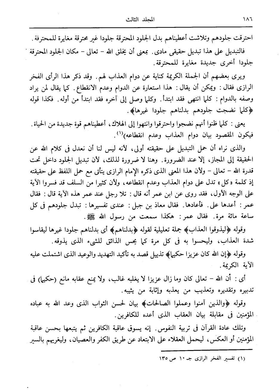 والذي نراه أن حمل التبديل على حقيقته أولى، لأنه ليس لنا أن نعدل في كلام الله عن الحقيقة إلى المجاز، إلا عند الضرورة. وهنا لا ضرورة لذلك، لأن تبديل الجلود داخل تحت قدرة الله- تعالى- ولأن هذا المعنى الذي ذكره الإمام الرازي يتأتى مع حمل اللفظ على حقيقته إذ كلمة «كل» تدل على دوام العذاب وعدم انقطاعه، ولأن كثيرا من السلف قد فسروا الآية على الوجه الأول، فقد روى عن ابن عمر أنه قال: تلا رجل عند عمر هذه الآية قال: فقال عمر: أعدها على. فأعادها. فقال معاذ بن جبل: عندي تفسيرها: تبدل جلودهم في كل ساعة مائة مرة. فقال عمر: هكذا سمعت من رسول الله صلى الله عليه وسلم.