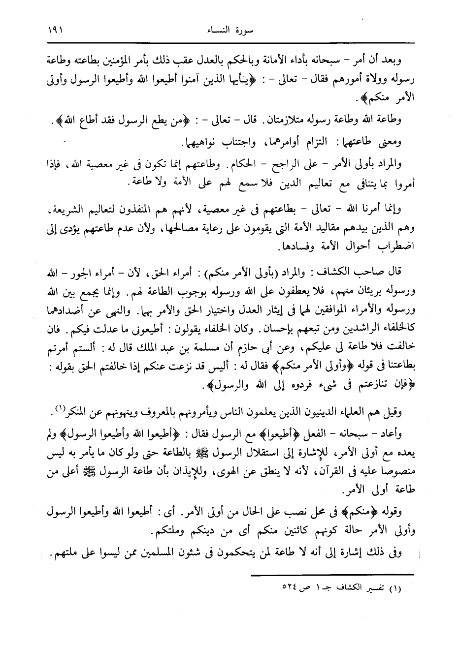 قال صاحب الكشاف: والمراد (بأولى الأمر منكم) : أمراء الحق، لأن- أمراء الجور- الله ورسوله بريئان منهم، فلا يعطفون على الله ورسوله بوجوب الطاعة لهم. وإنما يجمع بين الله ورسوله والأمراء الموافقين لهما في إيثار العدل واختيار الحق والأمر بهما. والنهى عن أضدادهما كالخلفاء الراشدين ومن تبعهم بإحسان. وكان الخلفاء يقولون: أطيعونى ما عدلت فيكم. فان خالفت فلا طاعة لي عليكم، وعن أبى حازم أن مسلمة بن عبد الملك قال له: ألستم أمرتم بطاعتنا في قوله وَأُولِي الْأَمْرِ مِنْكُمْ فقال له: أليس قد نزعت عنكم إذا خالفتم الحق بقوله: