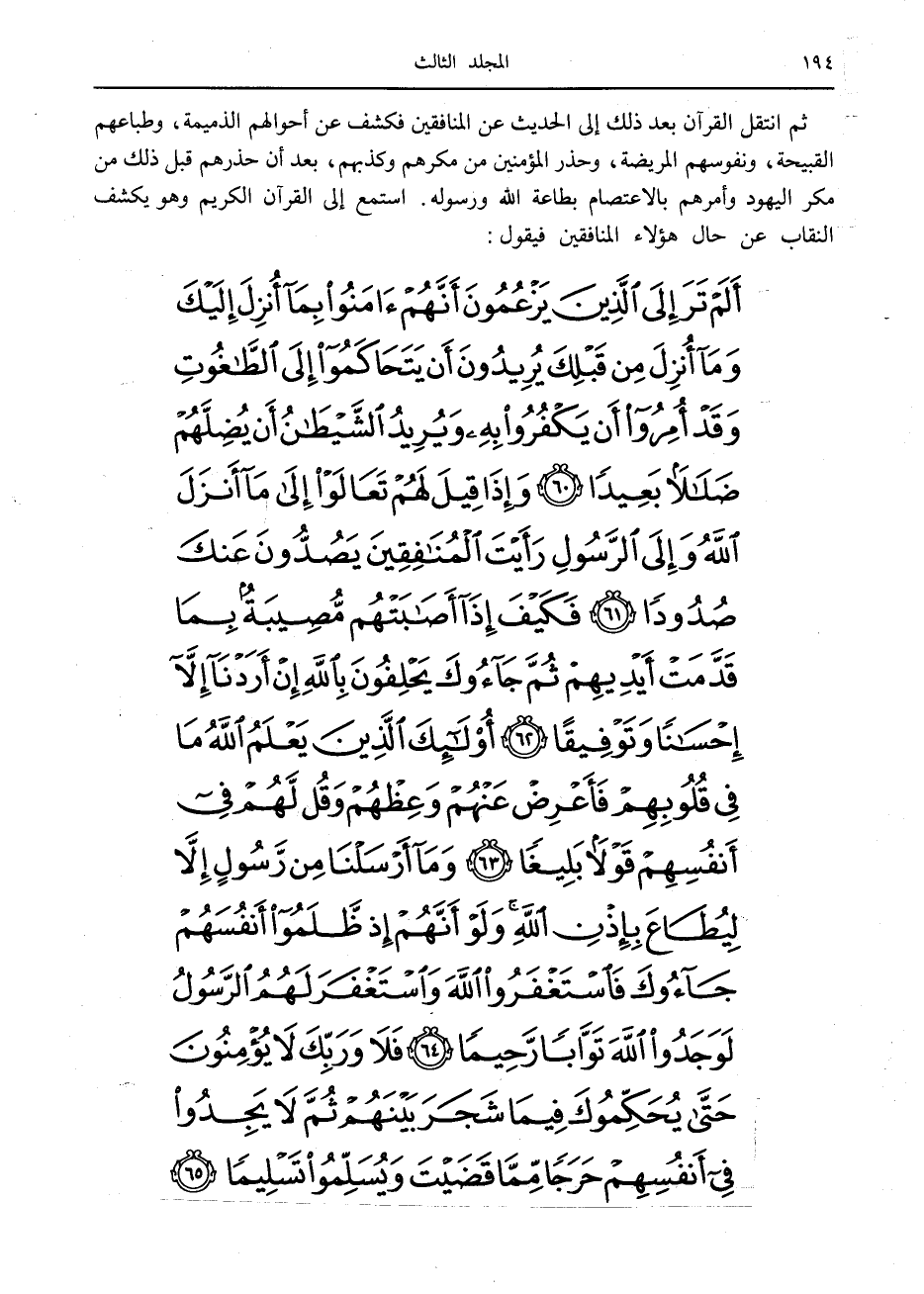 أَلَمْ تَرَ إِلَى الَّذِينَ يَزْعُمُونَ أَنَّهُمْ آمَنُوا بِما أُنْزِلَ إِلَيْكَ وَما أُنْزِلَ مِنْ قَبْلِكَ يُرِيدُونَ أَنْ يَتَحاكَمُوا إِلَى الطَّاغُوتِ وَقَدْ أُمِرُوا أَنْ يَكْفُرُوا بِهِ وَيُرِيدُ الشَّيْطانُ أَنْ يُضِلَّهُمْ ضَلالاً بَعِيداً (60) وَإِذا قِيلَ لَهُمْ تَعالَوْا إِلى ما أَنْزَلَ اللَّهُ وَإِلَى الرَّسُولِ رَأَيْتَ الْمُنافِقِينَ يَصُدُّونَ عَنْكَ صُدُوداً (61) فَكَيْفَ إِذا أَصابَتْهُمْ مُصِيبَةٌ بِما قَدَّمَتْ أَيْدِيهِمْ ثُمَّ جاؤُكَ يَحْلِفُونَ بِاللَّهِ إِنْ أَرَدْنا إِلاَّ إِحْساناً وَتَوْفِيقاً (62) أُولئِكَ الَّذِينَ يَعْلَمُ اللَّهُ ما فِي قُلُوبِهِمْ فَأَعْرِضْ عَنْهُمْ وَعِظْهُمْ وَقُلْ لَهُمْ فِي أَنْفُسِهِمْ قَوْلاً بَلِيغاً (63) وَما أَرْسَلْنا مِنْ رَسُولٍ إِلاَّ لِيُطاعَ بِإِذْنِ اللَّهِ وَلَوْ أَنَّهُمْ إِذْ ظَلَمُوا أَنْفُسَهُمْ جاؤُكَ فَاسْتَغْفَرُوا اللَّهَ وَاسْتَغْفَرَ لَهُمُ الرَّسُولُ لَوَجَدُوا اللَّهَ تَوَّاباً رَحِيماً (64)