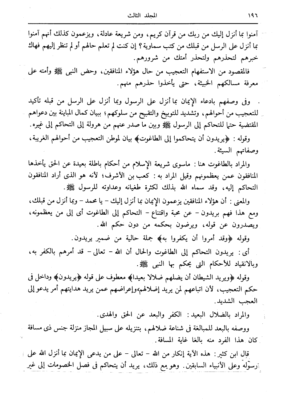 قال ابن كثير: هذه الآية إنكار من الله- تعالى- على من يدعى الإيمان بما أنزل الله على رسوله وعلى الأنبياء السابقين. وهو مع ذلك، يريد أن يتحاكم في فصل الخصومات إلى غير