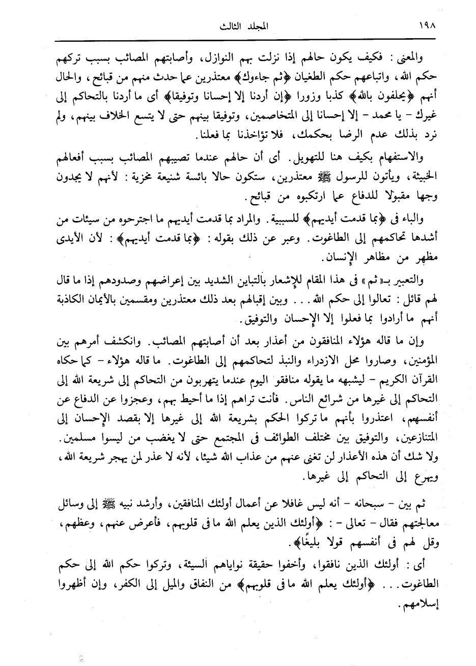 وإن ما قاله هؤلاء المنافقون من أعذار بعد أن أصابتهم المصائب. وانكشف أمرهم بين المؤمنين، وصاروا محل الازدراء والنبذ لتحاكمهم إلى الطاغوت. ما قاله هؤلاء- كما حكاه القرآن الكريم- ليشبهه ما يقوله منافقو اليوم عند ما يتهربون من التحاكم إلى شريعة الله إلى التحاكم إلى غيرها من شرائع الناس. فأنت تراهم إذا ما أحيط بهم، وعجزوا عن الدفاع عن أنفسهم، اعتذروا بأنهم ما تركوا الحكم بشريعة الله إلى غيرها إلا بقصد الإحسان إلى المتنازعين، والتوفيق بين مختلف الطوائف في المجتمع حتى لا يغضب من ليسوا مسلمين.