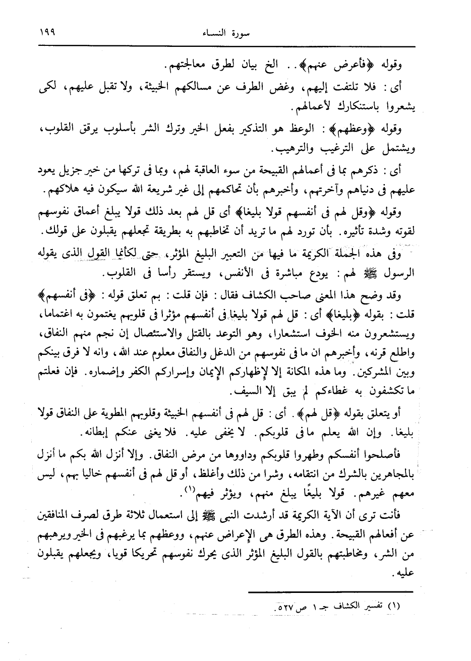 وقد وضح هذا المعنى صاحب الكشاف فقال: فإن قلت: بم تعلق قوله: فِي أَنْفُسِهِمْ قلت: بقوله بَلِيغاً أى: قل لهم قولا بليغا في أنفسهم مؤثرا في قلوبهم يغتمون به اغتماما، ويستشعرون منه الخوف استشعارا، وهو التوعد بالقتل والاستئصال إن نجم منهم النفاق، وأطلع قرنه، وأخبرهم أن ما في نفوسهم من الدغل والنفاق معلوم عند الله، وأنه لا فرق بينكم وبين المشركين. وما هذه المكانة إلا لإظهاركم الإيمان وإسراركم الكفر وإضماره. فإن فعلتم ما تكشفون به غطاءكم لم يبق إلا السيف.