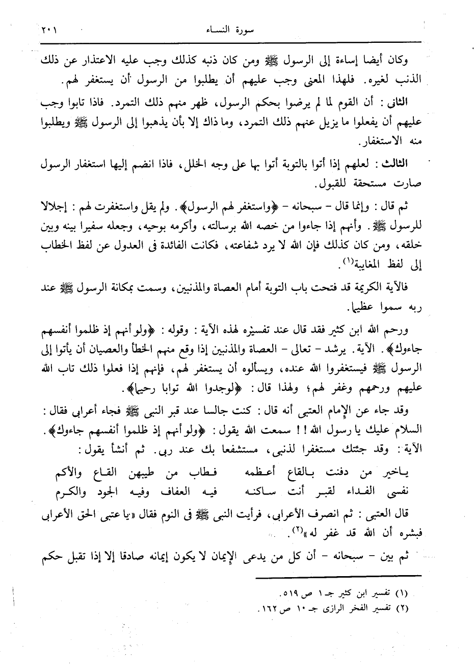ورحم الله ابن كثير فقد قال عند تفسيره لهذه الآية: وقوله: وَلَوْ أَنَّهُمْ إِذْ ظَلَمُوا أَنْفُسَهُمْ جاؤُكَ. الآية. يرشد- تعالى- العصاة والمذنبين إذا وقع منهم الخطأ والعصيان أن يأتوا إلى الرسول صلى الله عليه وسلم فيستغفروا الله عنده، ويسألوه أن يستغفر لهم، فإنهم إذا فعلوا ذلك تاب الله عليهم ورحمهم وغفر لهم ولهذا قال: لَوَجَدُوا اللَّهَ تَوَّاباً رَحِيماً.