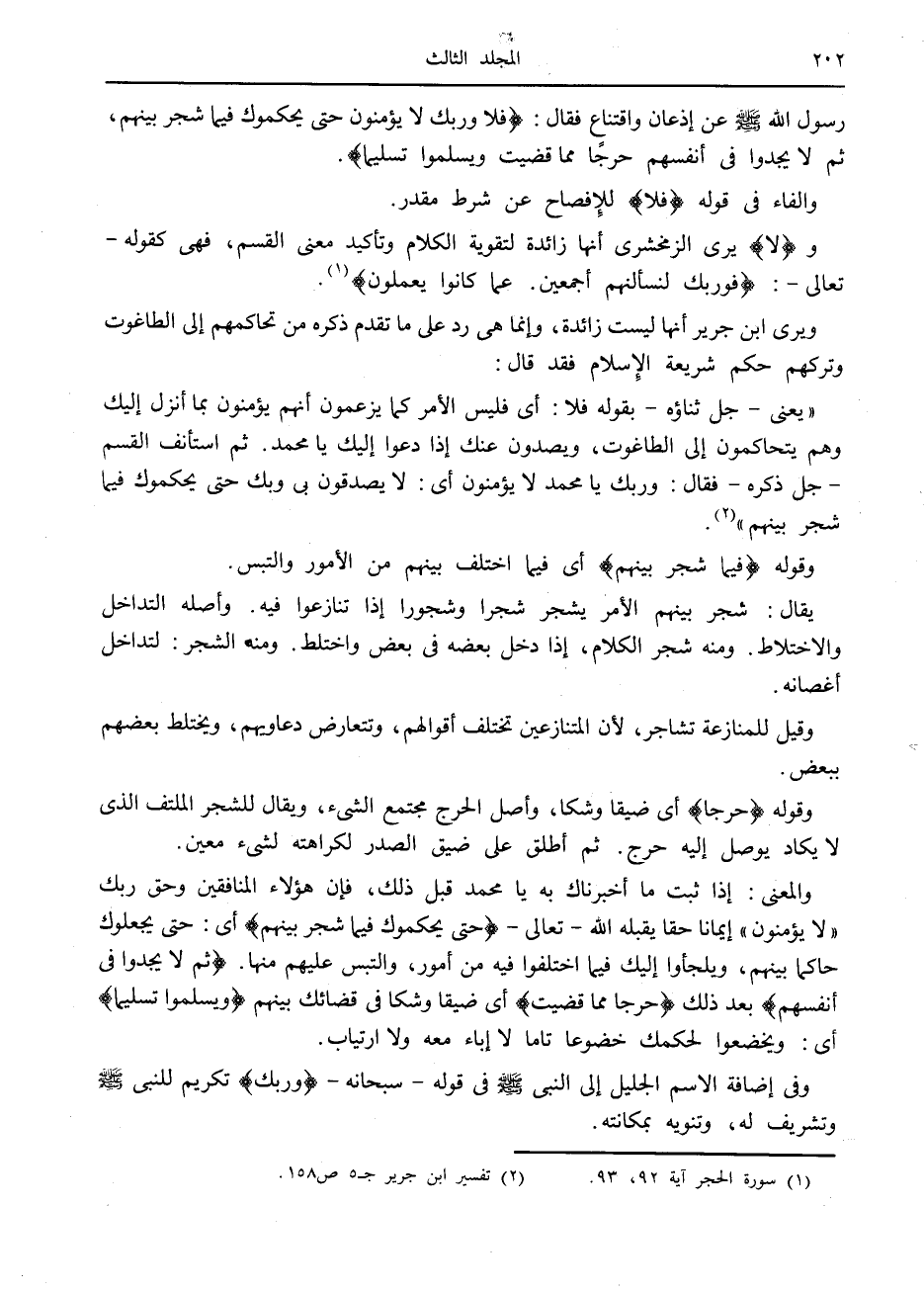 «يعنى- جل ثناؤه- بقوله فلا: أى فليس الأمر كما يزعمون أنهم يؤمنون بما أنزل إليك وهم يتحاكمون إلى الطاغوت، ويصدون عنك إذا دعوا إليك يا محمد. ثم استأنف القسم- جل ذكره- فقال: وربك يا محمد لا يؤمنون أى: لا يصدقون بي وبك حتى يحكموك فيما شجر بينهم» «2» .