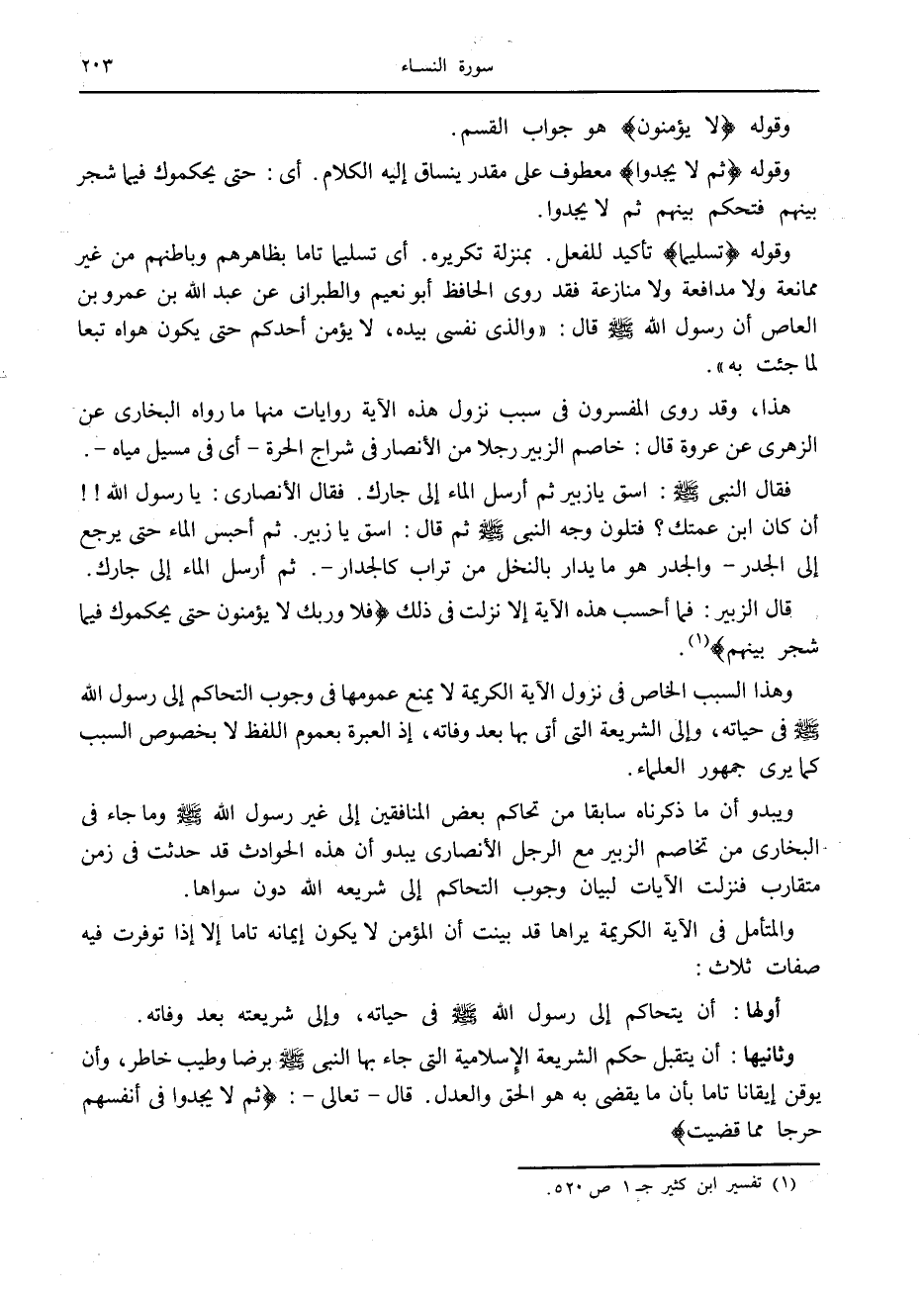 قال الزبير: فما أحسب هذه الآية إلا نزلت في ذلك فَلا وَرَبِّكَ لا يُؤْمِنُونَ حَتَّى يُحَكِّمُوكَ فِيما شَجَرَ بَيْنَهُمْ «1» .