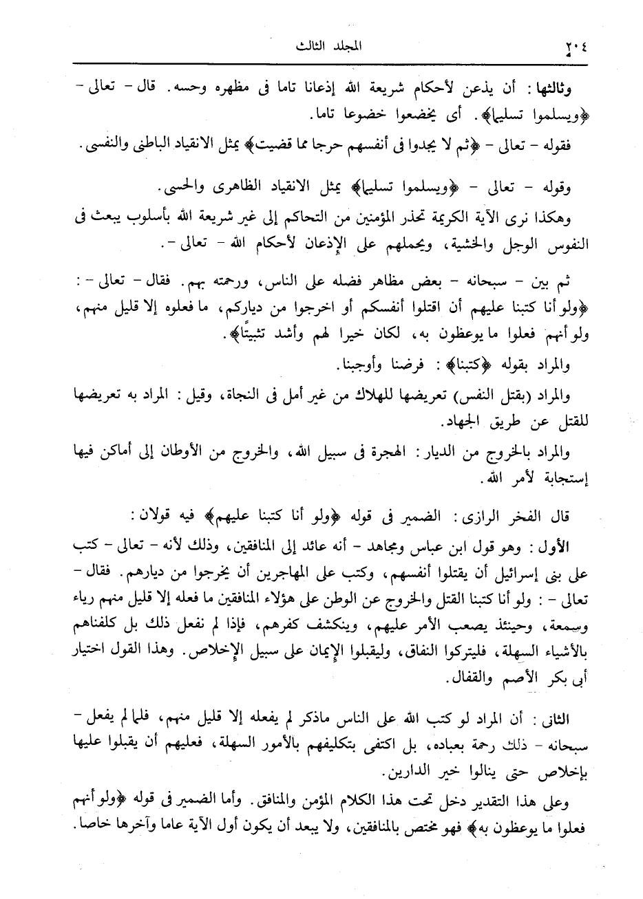 وثالثها: أن يذعن لأحكام شريعة الله إذعانا تاما في مظهره وحسه. قال- تعالى- وَيُسَلِّمُوا تَسْلِيماً. أى يخضعوا خضوعا تاما.