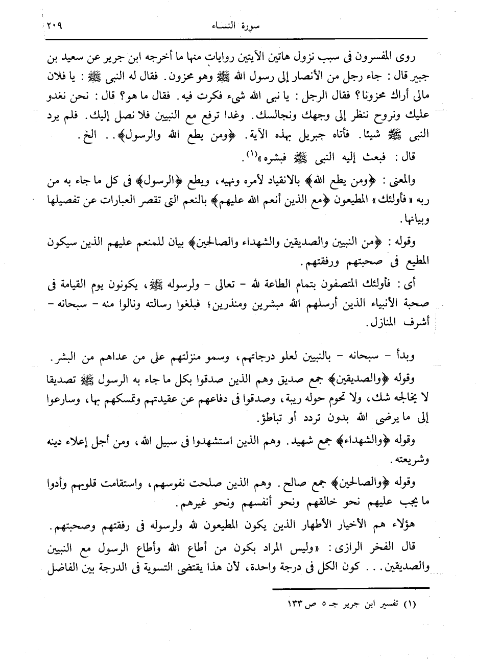 قال الفخر الرازي: «وليس المراد بكون من أطاع الله وأطاع الرسول مع النبيين والصديقين ... كون الكل في درجة واحدة، لأن هذا يقتضى التسوية في الدرجة بين الفاضل