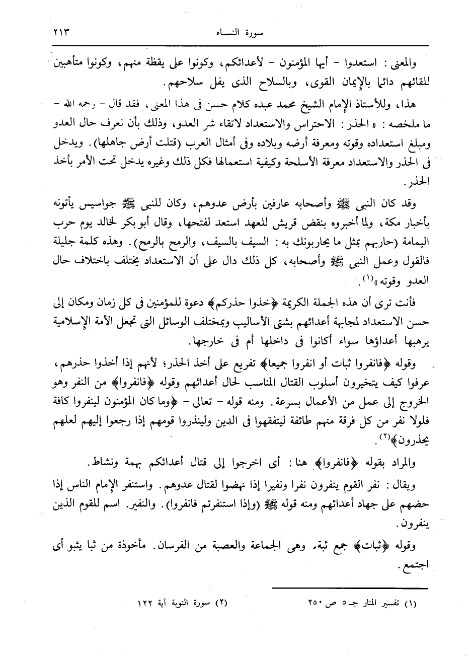 هذا، وللأستاذ الإمام الشيخ محمد عبده كلام حسن في هذا المعنى، فقد قال- رحمه الله- ما ملخصه: «الحذر: الاحتراس والاستعداد لاتقاء شر العدو، وذلك بأن نعرف حال العدو ومبلغ استعداده وقوته ومعرفة أرضه وبلاده وفي أمثال العرب (قتلت أرض جاهلها) . ويدخل في الحذر والاستعداد معرفة الأسلحة وكيفية استعمالها فكل ذلك وغيره يدخل تحت الأمر بأخذ الحذر.
