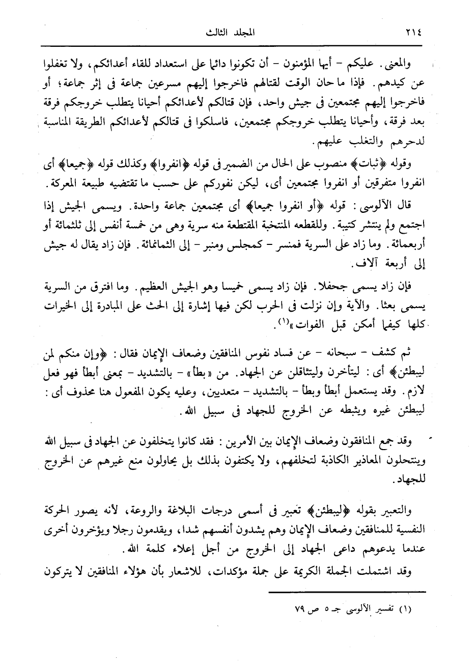 وقوله ثُباتٍ منصوب على الحال من الضمير في قوله انْفِرُوا وكذلك قوله جَمِيعاً أى انفروا متفرقين أو انفروا مجتمعين أى، ليكن نفوركم على حسب ما تقتضيه طبيعة المعركة.