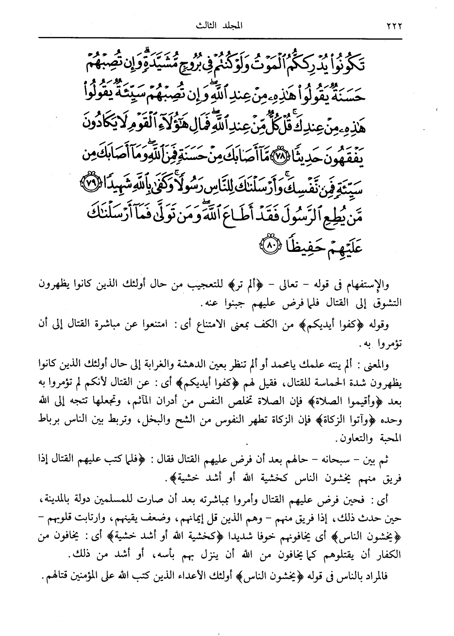 ثم بين- سبحانه- حالهم بعد أن فرض عليهم القتال فقال: فَلَمَّا كُتِبَ عَلَيْهِمُ الْقِتالُ إِذا فَرِيقٌ مِنْهُمْ يَخْشَوْنَ النَّاسَ كَخَشْيَةِ اللَّهِ أَوْ أَشَدَّ خَشْيَةً.