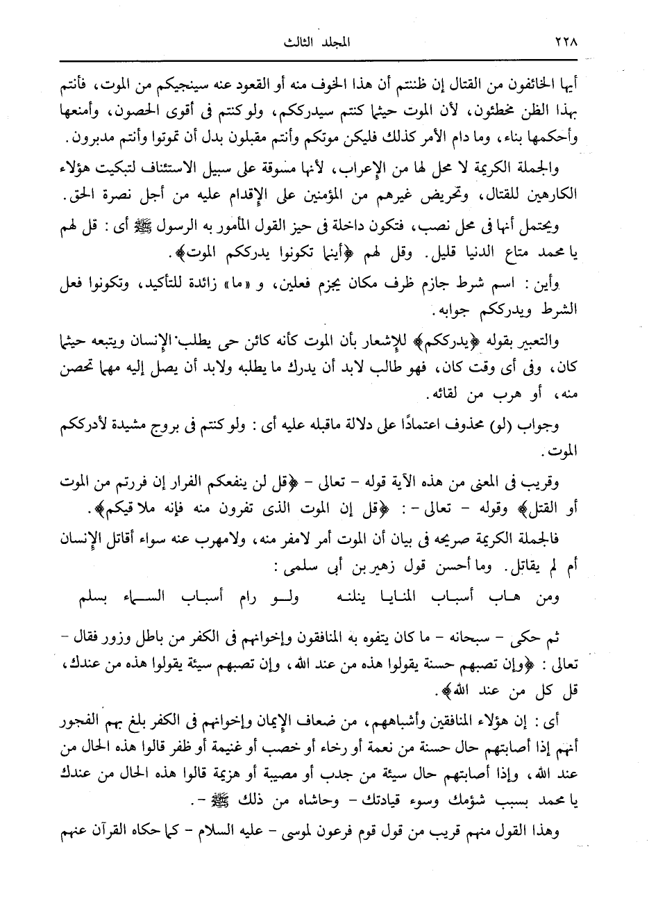 أيها الخائفون من القتال إن ظننتم أن هذا الخوف منه أو القعود عنه سينجيكم من الموت، فأنتم بهذا الظن مخطئون، لأن الموت حيثما كنتم سيدرككم، ولو كنتم في أقوى الحصون، وأمنعها وأحكمها بناء، وما دام الأمر كذلك فليكن موتكم وأنتم مقبلون بدل أن تموتوا وأنتم مدبرون.