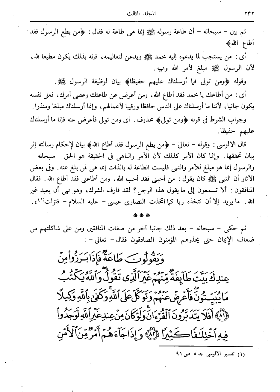 قال الآلوسى: وقوله- تعالى- مَنْ يُطِعِ الرَّسُولَ فَقَدْ أَطاعَ اللَّهَ بيان لإحكام رسالته إثر بيان تحققها. وإنما كان الأمر كذلك لأن الآمر والناهي في الحقيقة هو الحق- سبحانه- والرسول إنما هو مبلغ للأمر والنهى فليست الطاعة له بالذات إنما هي لمن بلغ عنه. وفي بعض الآثار أن النبي صلى الله عليه وسلم كان يقول: من أحبنى فقد أحب الله، ومن أطاعنى فقد أطاع الله. فقال المنافقون: ألا تسمعون إلى ما يقول هذا الرجل؟ لقد قارف الشرك، وهو نهى أن يعبد غير الله. ما يريد إلا أن نتخذه ربا كما اتخذت النصارى عيسى- عليه السلام- فنزلت «1» » .