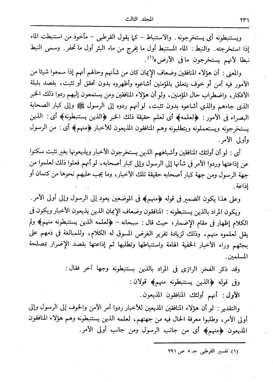 ويكون المراد بالذين يستنبطونه: المنافقون وضعاف الإيمان الذين يذيعون الأخبار ويكون في الكلام إظهار في مقام الإضمار حيث قال: سبحانه- لَعَلِمَهُ الَّذِينَ يَسْتَنْبِطُونَهُ مِنْهُمْ ولم يقل لعلموه منهم، وذلك لزيادة تقرير الغرض المسوق له الكلام، وللمبالغة في ذمهم على بجثهم وراء الأخبار الخفية الهامة واستنباطها وتطلبها ثم إذاعتها بقصد الإضرار بمصلحة المسلمين.