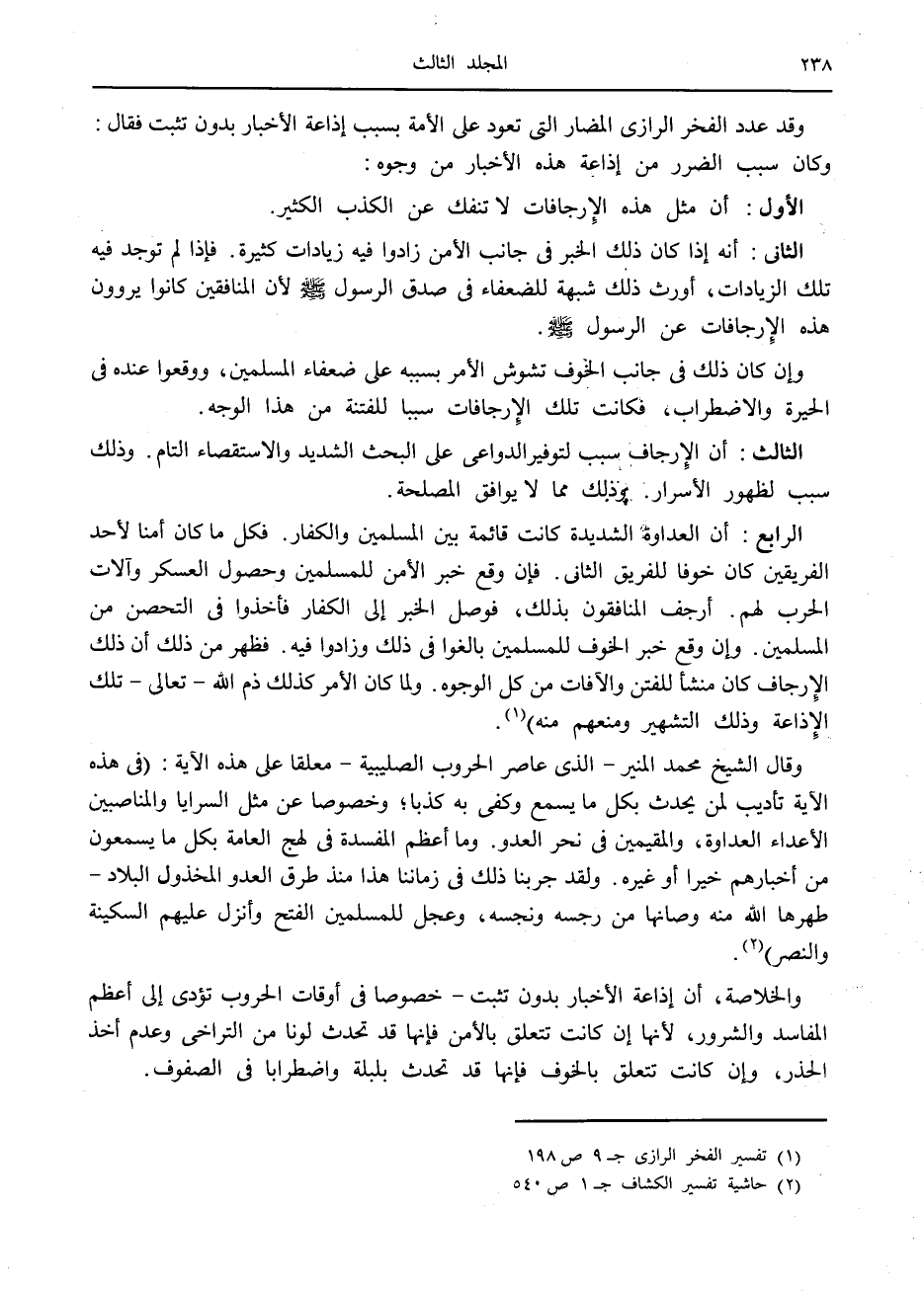 وقال الشيخ محمد المنير- الذي عاصر الحروب الصليبية- معلقا على هذه الآية: (في هذه الآية تأديب لمن يحدث بكل ما يسمع وكفى به كذبا وخصوصا عن مثل السرايا والمناصبين الأعداء العداوة، والمقيمين في نحر العدو. وما أعظم المفسدة في لهج العامة بكل ما يسمعون من أخبارهم خيرا أو غيره. ولقد جربنا ذلك في زماننا هذا منذ طرق العدو المخذول البلاد- طهرها الله منه وصانها من رجسه ونجسه، وعجل للمسلمين الفتح وأنزل عليهم السكينة والنصر) «2» .
