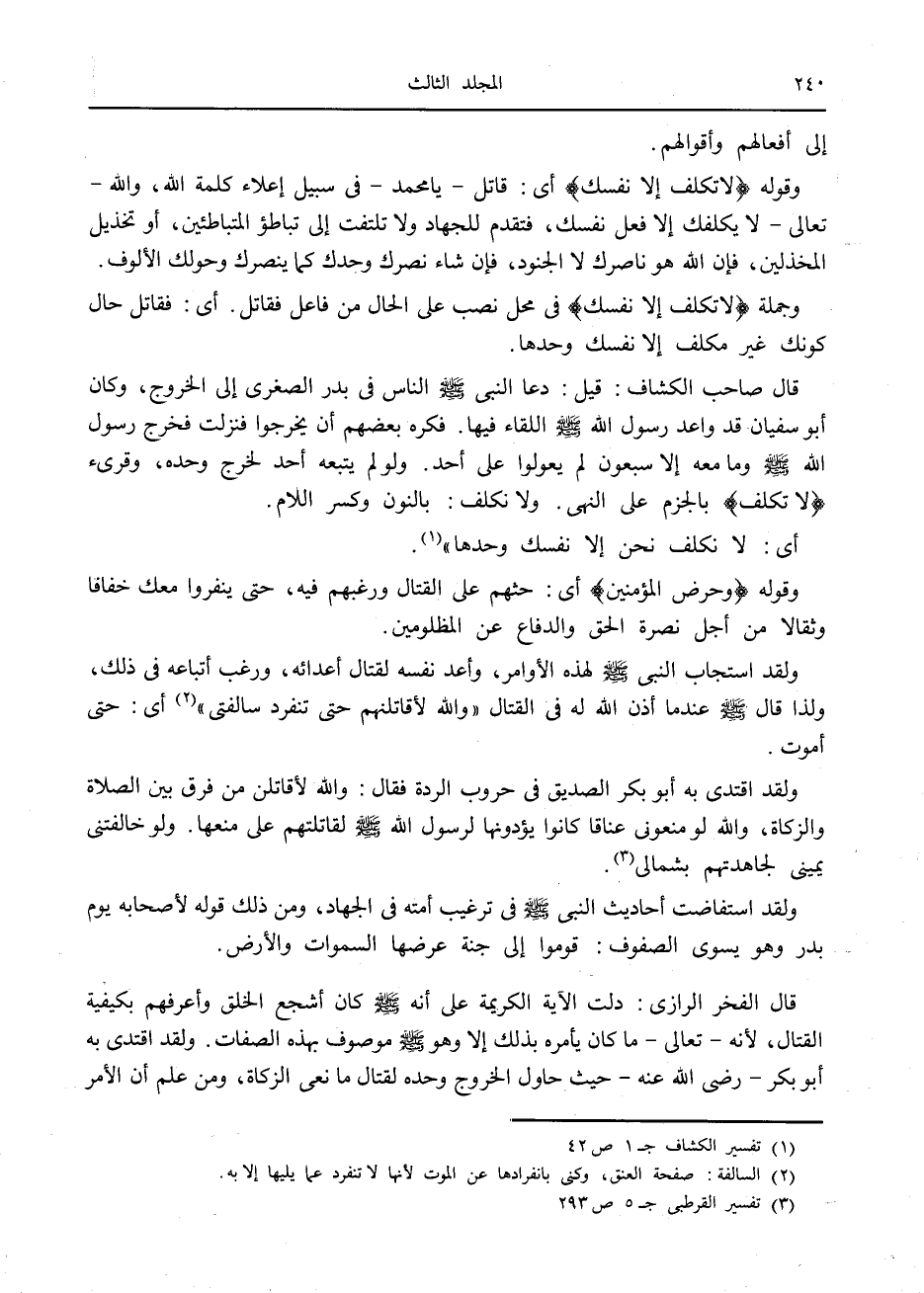 ولقد استجاب النبي صلى الله عليه وسلم لهذه الأوامر، وأعد نفسه لقتال أعدائه، ورغب أتباعه في ذلك، ولذا قال صلى الله عليه وسلم عند ما أذن الله له في القتال «والله لأقاتلنهم حتى تنفرد سالفتي» «2» أى: حتى أموت.