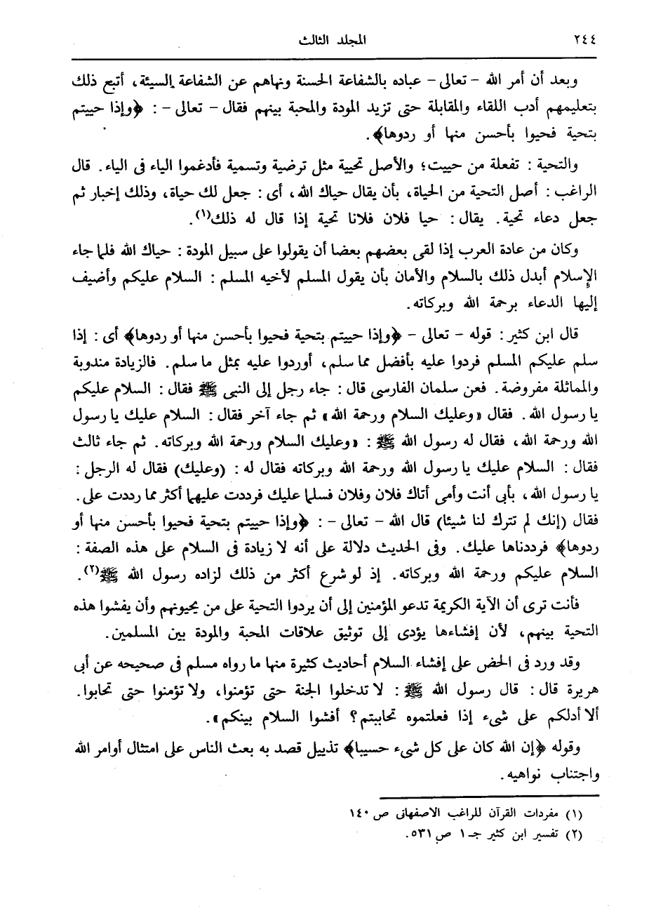 قال ابن كثير: قوله- تعالى- وَإِذا حُيِّيتُمْ بِتَحِيَّةٍ فَحَيُّوا بِأَحْسَنَ مِنْها أَوْ رُدُّوها أى: إذا سلم عليكم المسلم فردوا عليه بأفضل مما سلم، أوردوا عليه بمثل ما سلم. فالزيادة مندوبة والمماثلة مفروضة. فعن سلمان الفارسي قال: جاء رجل إلى النبي صلى الله عليه وسلم فقال: السلام عليكم يا رسول الله. فقال «وعليك السلام ورحمة الله» ثم جاء آخر فقال: السلام عليك يا رسول الله ورحمة الله، فقال له رسول الله صلى الله عليه وسلم: «وعليك السلام ورحمة الله وبركاته. ثم جاء ثالث فقال: السلام عليك يا رسول الله ورحمة الله وبركاته فقال له: (وعليك) فقال له الرجل: