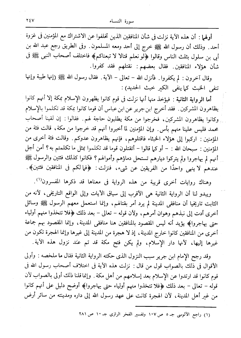 ويبدو لنا أن الرواية الثانية هي الأقرب إلى سياق الآيات وإلى الواقع التاريخى، لأنه من الثابت تاريخيا أن منافقي المدينة لم يرد أمر بقتالهم، وإنما استعمل معهم الرسول صلى الله عليه وسلم وسائل أخرى أدت إلى نبذهم وهوان أمرهم، ولأن قوله- تعالى- بعد ذلك فَلا تَتَّخِذُوا مِنْهُمْ أَوْلِياءَ حَتَّى يُهاجِرُوا يؤيد أنه ليس المقصود بالمنافقين هنا منافقي المدينة، وإنما المقصود بهم جماعة أخرى من المنافقين كانوا خارج المدينة، إذ لا هجرة من المدينة إلى غيرها وإنما الهجرة تكون من غيرها إليها، لأنها دار الإسلام، ولم يكن فتح مكة قد تم عند نزول هذه الآية.