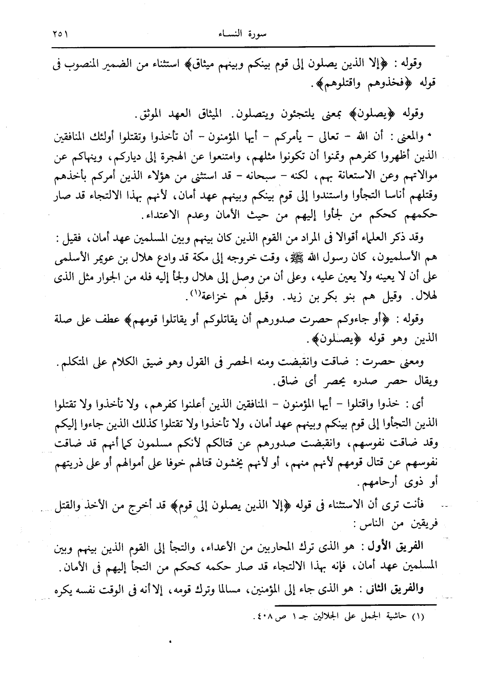 وقوله: إِلَّا الَّذِينَ يَصِلُونَ إِلى قَوْمٍ بَيْنَكُمْ وَبَيْنَهُمْ مِيثاقٌ استثناء من الضمير المنصوب في قوله فَخُذُوهُمْ وَاقْتُلُوهُمْ.
