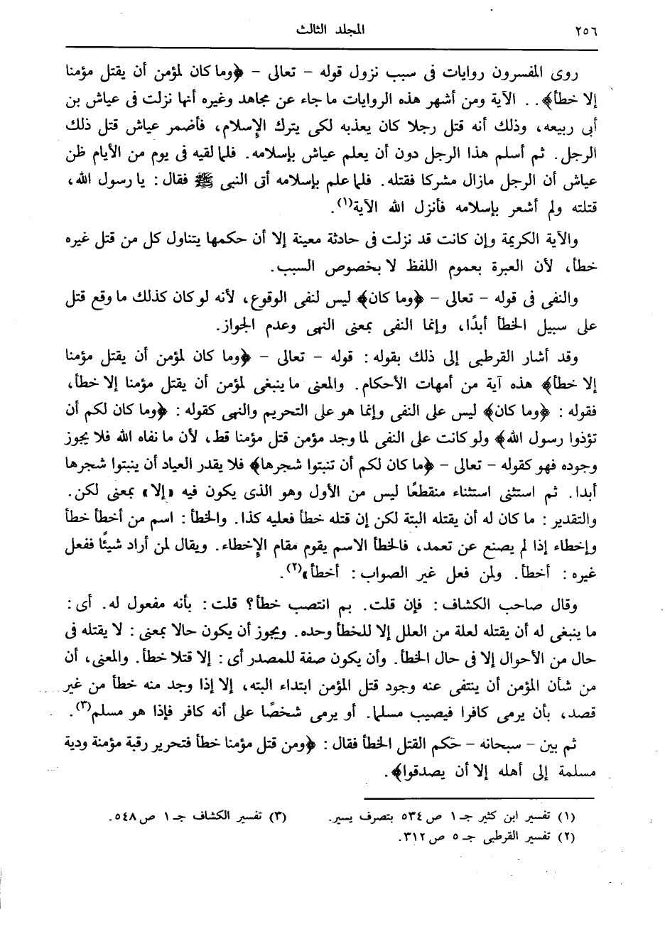 وقد أشار القرطبي إلى ذلك بقوله: قوله- تعالى- وَما كانَ لِمُؤْمِنٍ أَنْ يَقْتُلَ مُؤْمِناً إِلَّا خَطَأً هذه آية من أمهات الأحكام. والمعنى ما ينبغي لمؤمن أن يقتل مؤمنا إلا خطأ، فقوله: وَما كانَ ليس على النفي وإنما هو على التحريم والنهى كقوله: وَما كانَ لَكُمْ أَنْ تُؤْذُوا رَسُولَ اللَّهِ ولو كانت على النفي لما وجد مؤمن قتل مؤمنا قط، لأن ما نفاه الله فلا يجوز وجوده فهو كقوله- تعالى- ما كانَ لَكُمْ أَنْ تُنْبِتُوا شَجَرَها فلا يقدر العباد أن ينبتوا شجرها أبدا. ثم استثنى استثناء منقطعا ليس من الأول وهو الذي يكون فيه «إلا» بمعنى لكن.