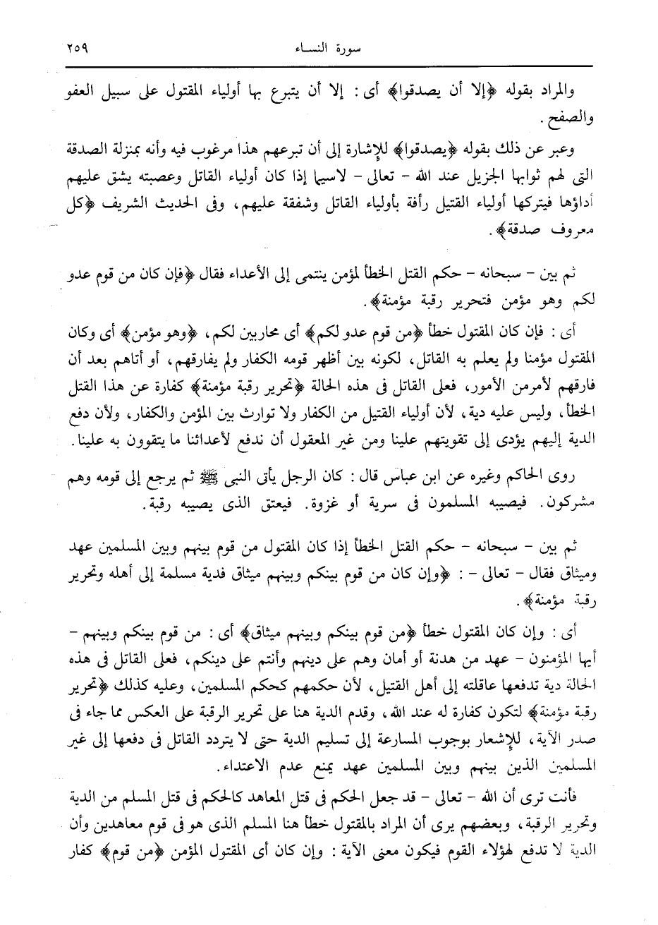 فأنت ترى أن الله- تعالى- قد جعل الحكم في قتل المعاهد كالحكم في قتل المسلم من الدية وتحرير الرقبة، وبعضهم يرى أن المراد بالمقتول خطأ هنا المسلم الذي هو في قوم معاهدين وأن الدية لا تدفع لهؤلاء القوم فيكون معنى الآية: وإن كان أى المقتول المؤمن مِنْ قَوْمٍ كفار