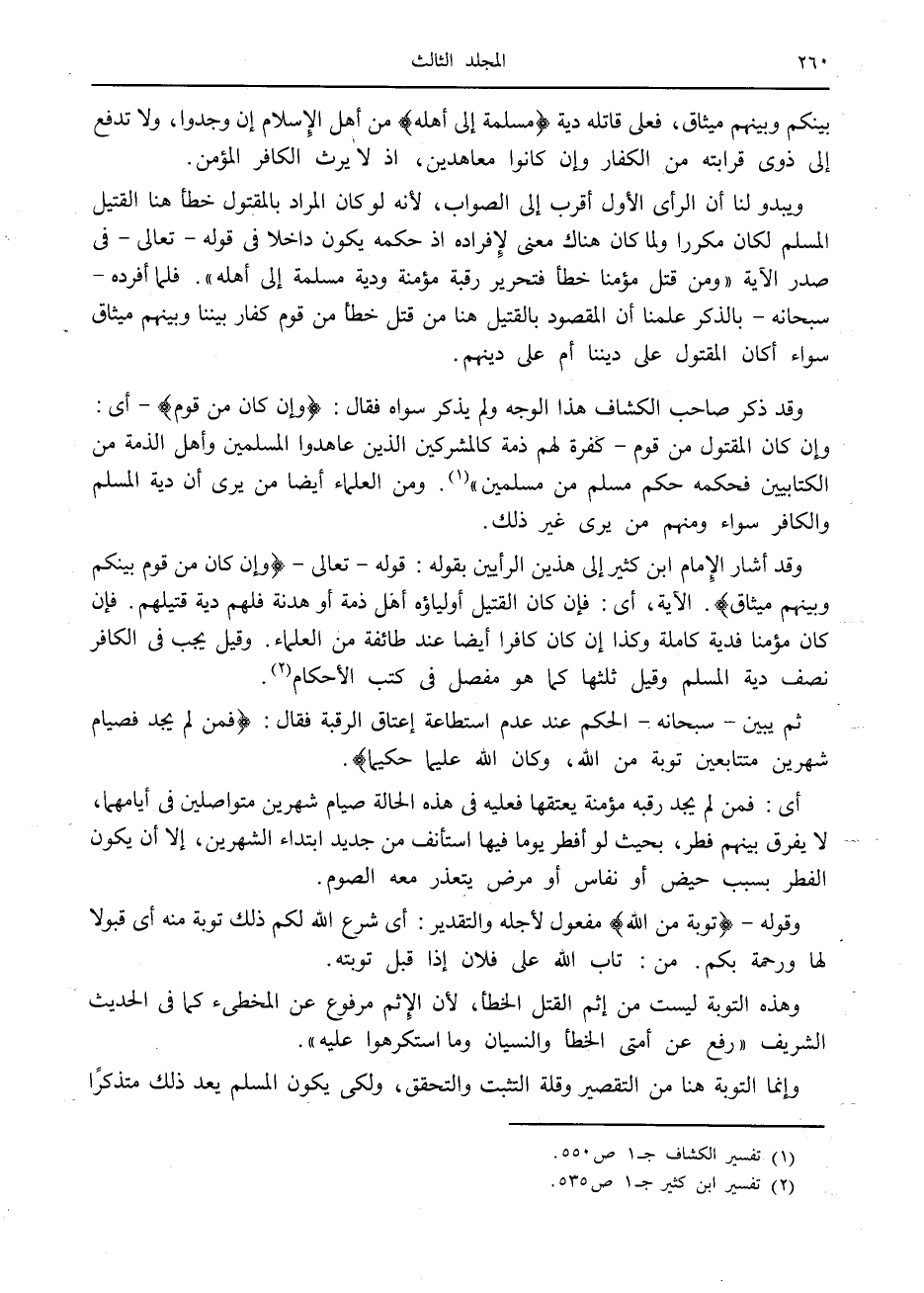 وقد أشار الإمام ابن كثير إلى هذين الرأيين بقوله: قوله- تعالى- وَإِنْ كانَ مِنْ قَوْمٍ بَيْنَكُمْ وَبَيْنَهُمْ مِيثاقٌ. الآية، أى: فإن كان القتيل أولياؤه أهل ذمة أو هدنة فلهم دية قتيلهم. فإن كان مؤمنا فدية كاملة وكذا إن كان كافرا أيضا عند طائفة من العلماء. وقيل يجب في الكافر نصف دية المسلم وقيل ثلثها كما هو مفصل في كتب الأحكام «2» .
