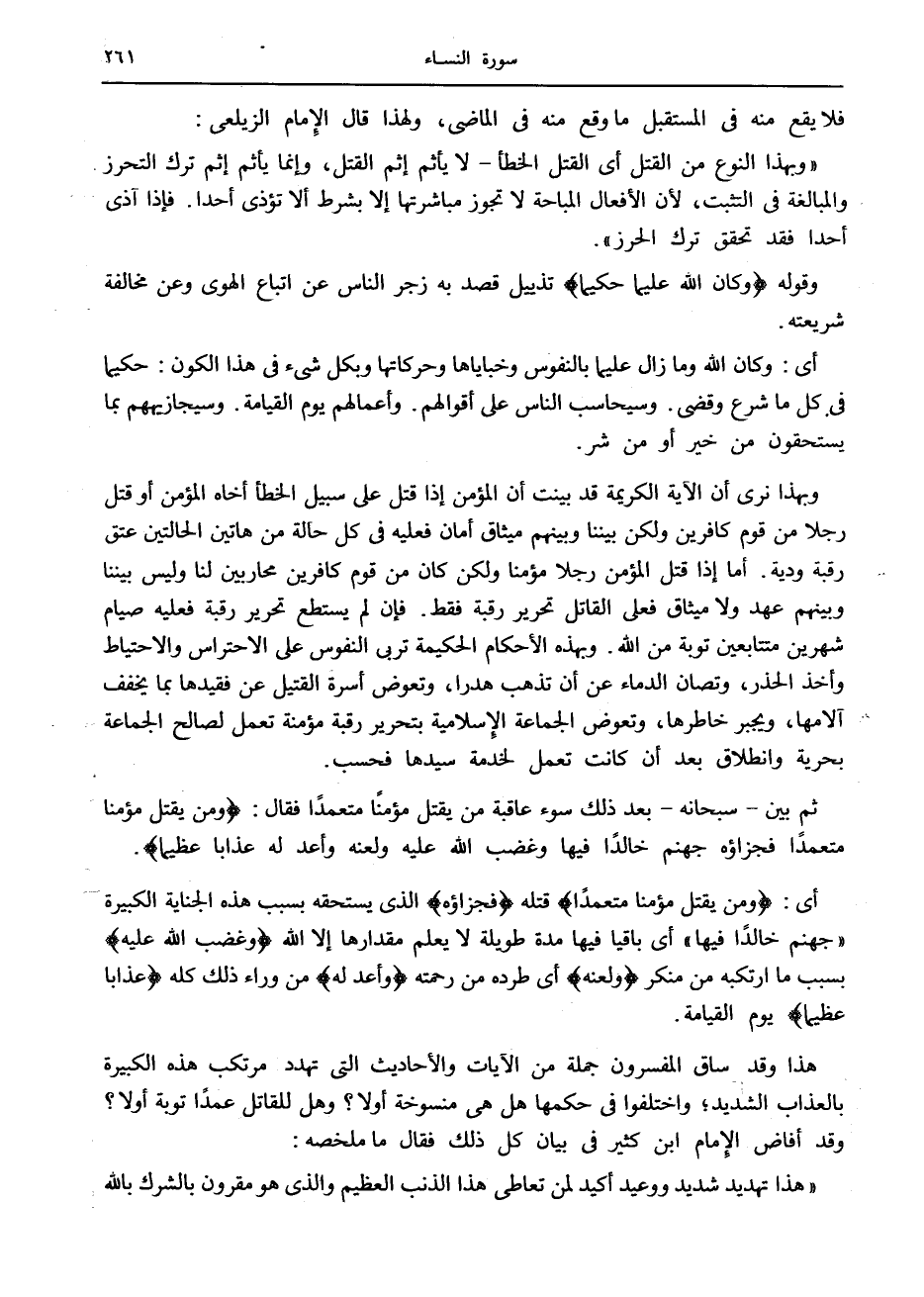 وبهذا نرى أن الآية الكريمة قد بينت أن المؤمن إذا قتل على سبيل الخطأ أخاه المؤمن أو قتل رجلا من قوم كافرين ولكن بيننا وبينهم ميثاق أمان فعليه في كل حالة من هاتين الحالتين عتق رقبة ودية. أما إذا قتل المؤمن رجلا مؤمنا ولكن كان من قوم كافرين محاربين لنا وليس بيننا وبينهم عهد ولا ميثاق فعلى القاتل تحرير رقبة فقط. فإن لم يستطع تحرير رقبة فعليه صيام شهرين متتابعين توبة من الله. وبهذه الأحكام الحكيمة تربى النفوس على الاحتراس والاحتياط وأخذ الحذر، وتصان الدماء عن أن تذهب هدرا، وتعوض أسرة القتيل عن فقيدها بما يخفف آلامها، ويجبر خاطرها، وتعوض الجماعة الإسلامية بتحرير رقبة مؤمنة تعمل لصالح الجماعة بحرية وانطلاق بعد أن كانت تعمل لخدمة سيدها فحسب.