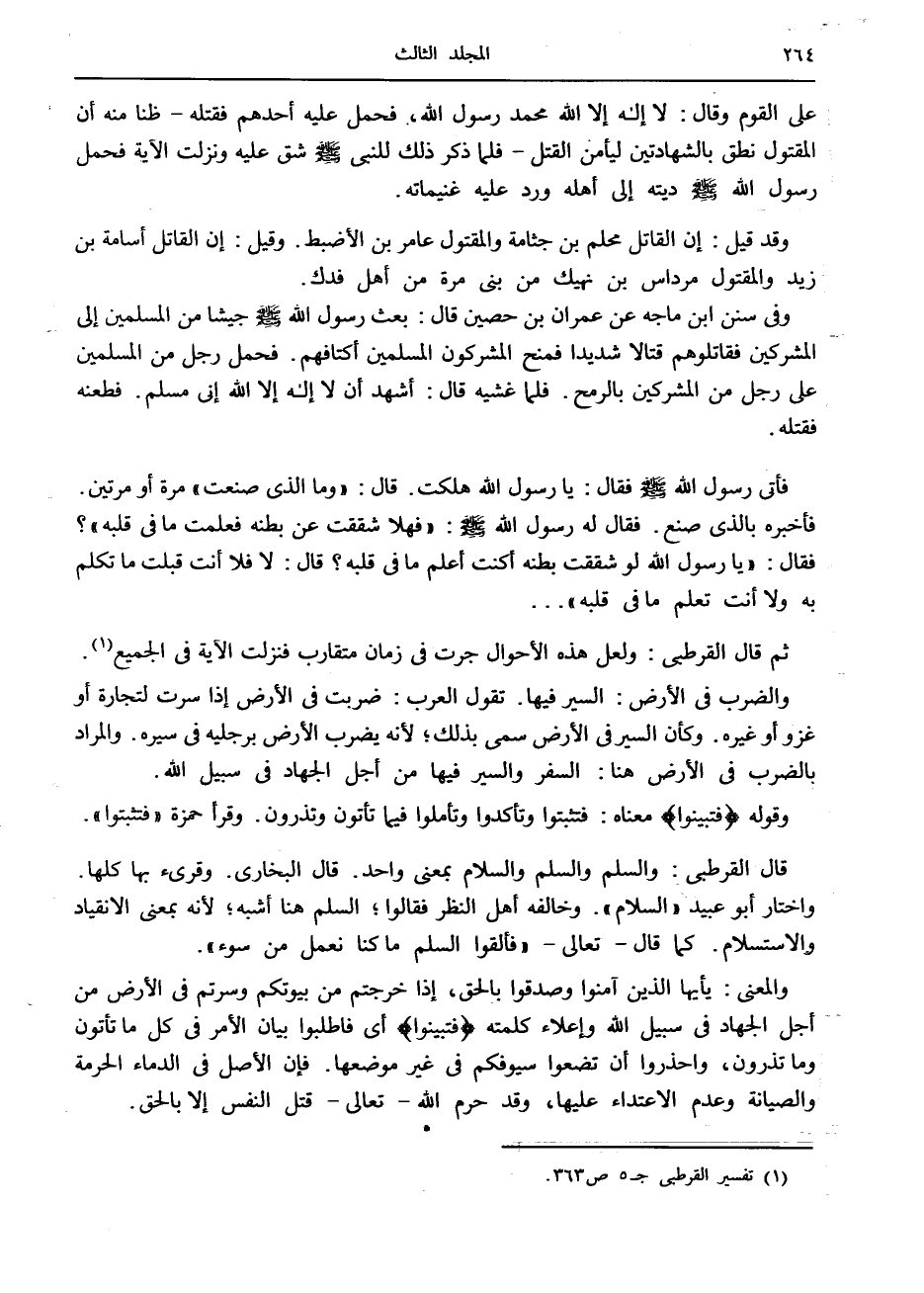 والمعنى: يا أيها الذين آمنوا وصدقوا بالحق، إذا خرجتم من بيوتكم وسرتم في الأرض من أجل الجهاد في سبيل الله وإعلاء كلمته فَتَبَيَّنُوا أى فاطلبوا بيان الأمر في كل ما تأتون وما تذرون، واحذروا أن تضعوا سيوفكم في غير موضعها. فإن الأصل في الدماء الحرمة والصيانة وعدم الاعتداء عليها، وقد حرم الله- تعالى- قتل النفس إلا بالحق.