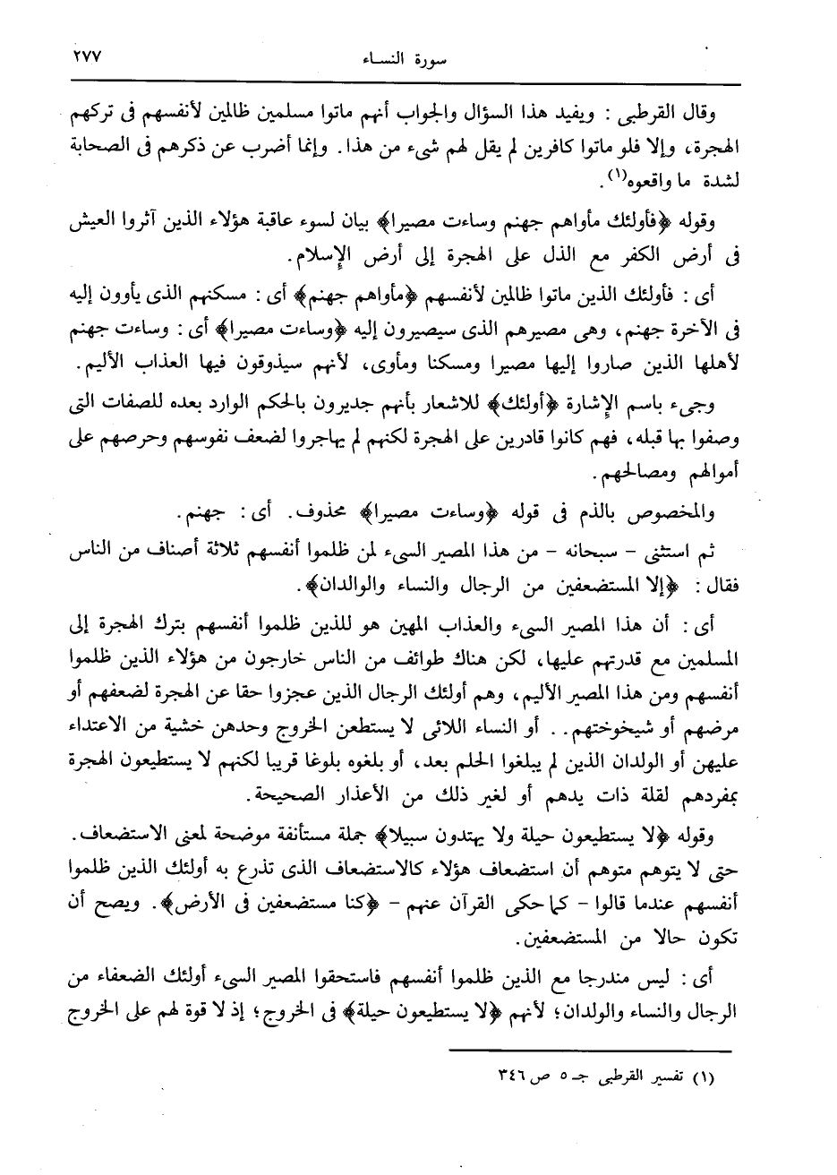 وقال القرطبي: ويفيد هذا السؤال والجواب أنهم ماتوا مسلمين ظالمين لأنفسهم في تركهم الهجرة، وإلا فلو ماتوا كافرين لم يقل لهم شيء من هذا. وإنما أضرب عن ذكرهم في الصحابة لشدة ما واقعوه «1» .