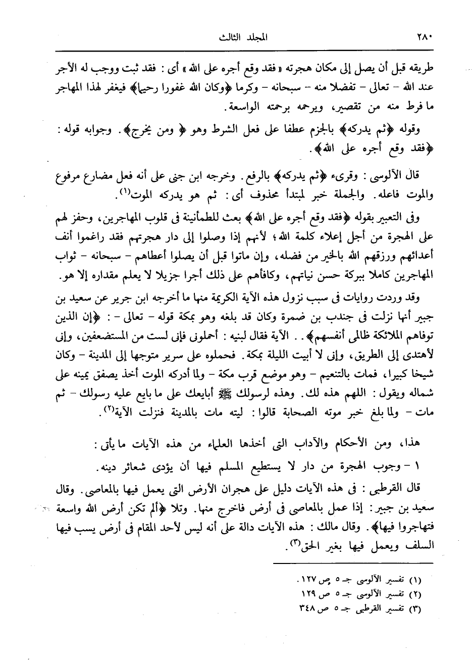 طريقه قبل أن يصل إلى مكان هجرته «فقد وقع أجره على الله» أى: فقد ثبت ووجب له الأجر عند الله- تعالى- تفضلا منه- سبحانه- وكرما وَكانَ اللَّهُ غَفُوراً رَحِيماً فيغفر لهذا المهاجر ما فرط منه من تقصير، ويرحمه برحمته الواسعة.