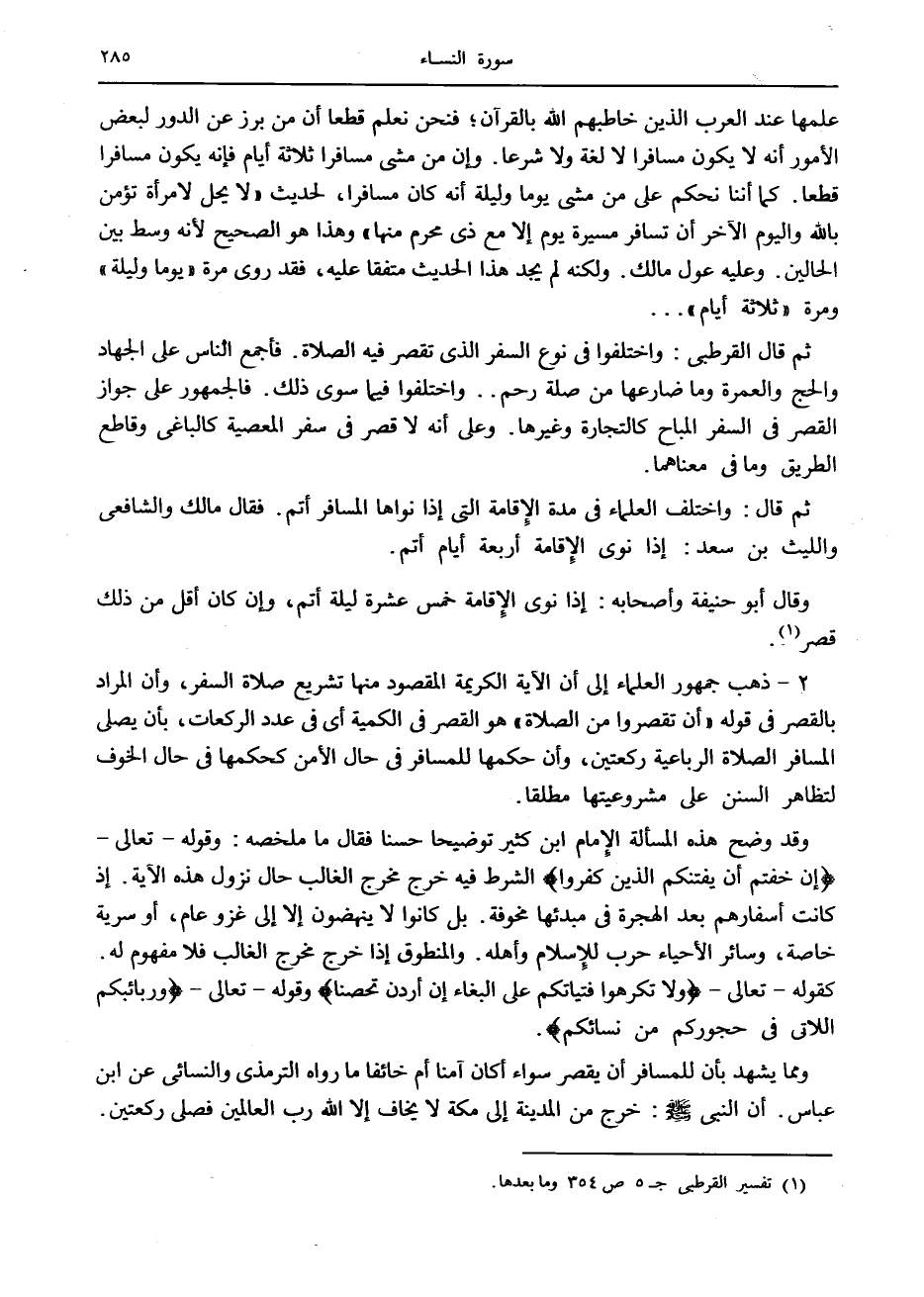 2- ذهب جمهور العلماء إلى أن الآية الكريمة المقصود منها تشريع صلاة السفر، وأن المراد بالقصر في قوله «أن تقصروا من الصلاة» هو القصر في الكمية أى في عدد الركعات، بأن يصلى المسافر الصلاة الرباعية ركعتين، وأن حكمها للمسافر في حال الأمن كحكمها في حال الخوف لتظاهر السنن على مشروعيتها مطلقا.