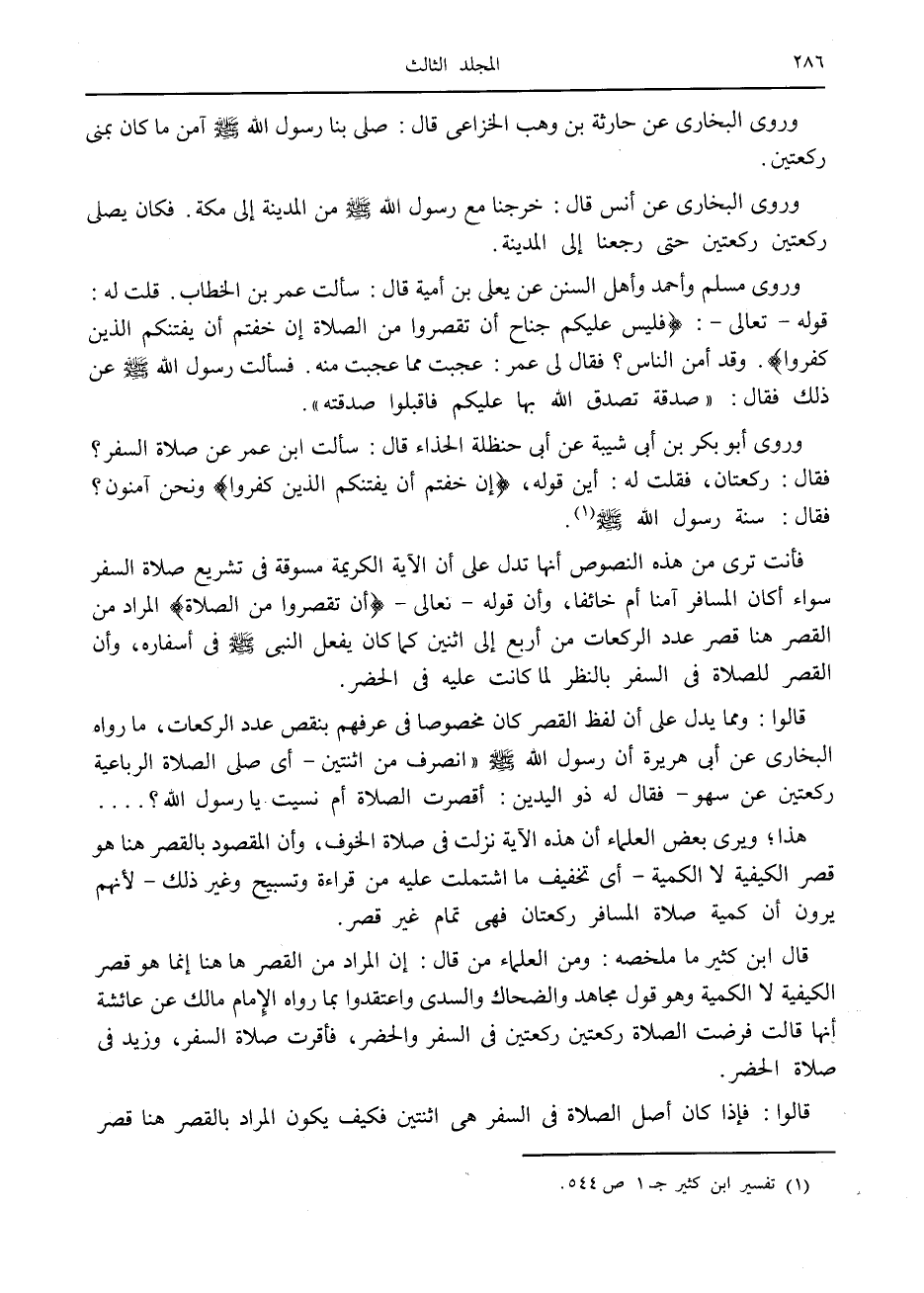 فأنت ترى من هذه النصوص أنها تدل على أن الآية الكريمة مسوقة في تشريع صلاة السفر سواء أكان المسافر آمنا أم خائفا، وأن قوله- تعالى- أَنْ تَقْصُرُوا مِنَ الصَّلاةِ المراد من القصر هنا قصر عدد الركعات من أربع إلى اثنين كما كان يفعل النبي صلى الله عليه وسلم في أسفاره، وأن القصر للصلاة في السفر بالنظر لما كانت عليه في الحضر.