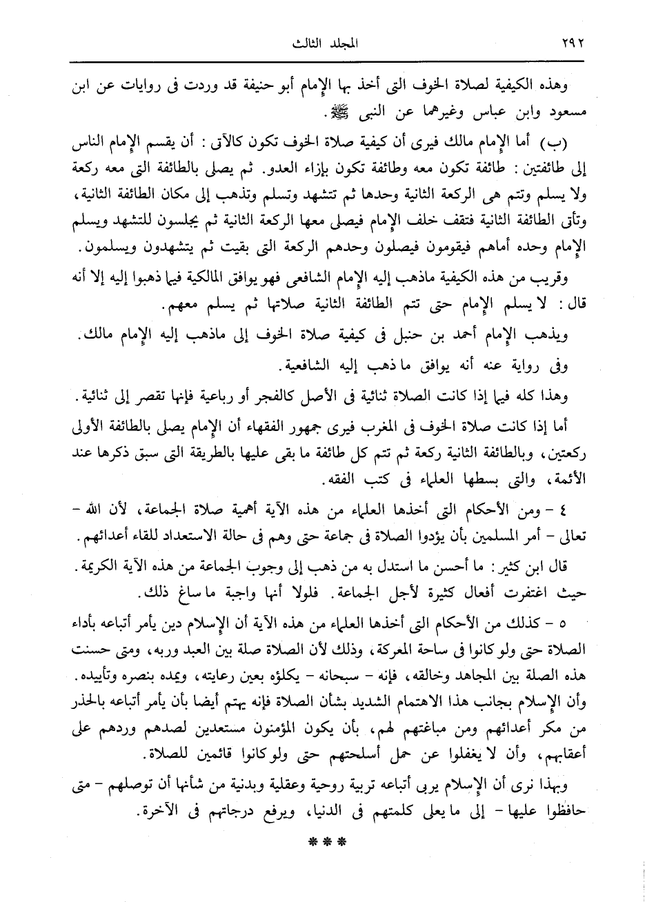 4- ومن الأحكام التي أخذها العلماء من هذه الآية أهمية صلاة الجماعة، لأن الله- تعالى- أمر المسلمين بأن يؤدوا الصلاة في جماعة حتى وهم في حالة الاستعداد للقاء أعدائهم.