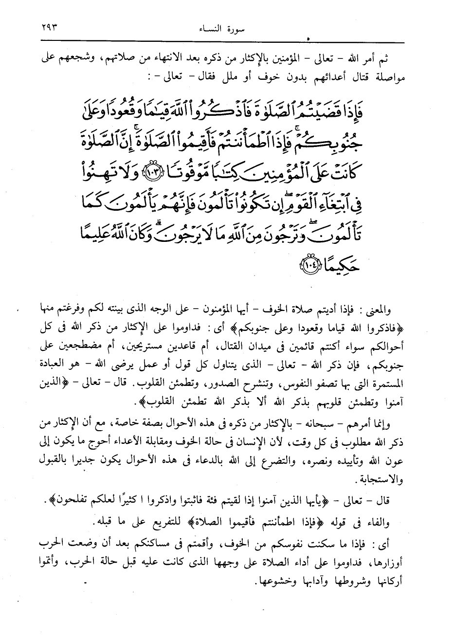 فَإِذا قَضَيْتُمُ الصَّلاةَ فَاذْكُرُوا اللَّهَ قِياماً وَقُعُوداً وَعَلى جُنُوبِكُمْ فَإِذَا اطْمَأْنَنْتُمْ فَأَقِيمُوا الصَّلاةَ إِنَّ الصَّلاةَ كانَتْ عَلَى الْمُؤْمِنِينَ كِتاباً مَوْقُوتاً (103) وَلا تَهِنُوا فِي ابْتِغاءِ الْقَوْمِ إِنْ تَكُونُوا تَأْلَمُونَ فَإِنَّهُمْ يَأْلَمُونَ كَما تَأْلَمُونَ وَتَرْجُونَ مِنَ اللَّهِ ما لا يَرْجُونَ وَكانَ اللَّهُ عَلِيماً حَكِيماً (104)