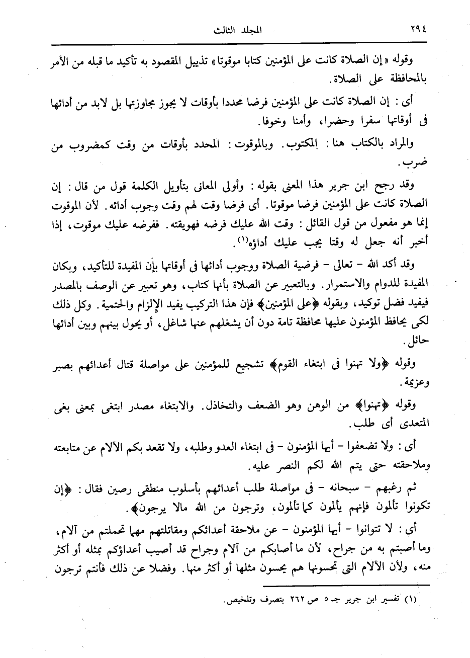 وقد رجح ابن جرير هذا المعنى بقوله: وأولى المعاني بتأويل الكلمة قول من قال: إن الصلاة كانت على المؤمنين فرضا موقوتا. أى فرضا وقت لهم وقت وجوب أدائه. لأن الموقوت إنما هو مفعول من قول القائل: وقت الله عليك فرضه فهو يقته. ففرضه عليك موقوت، إذا أخبر أنه جعل له وقتا يجب عليك أداؤه «1» .