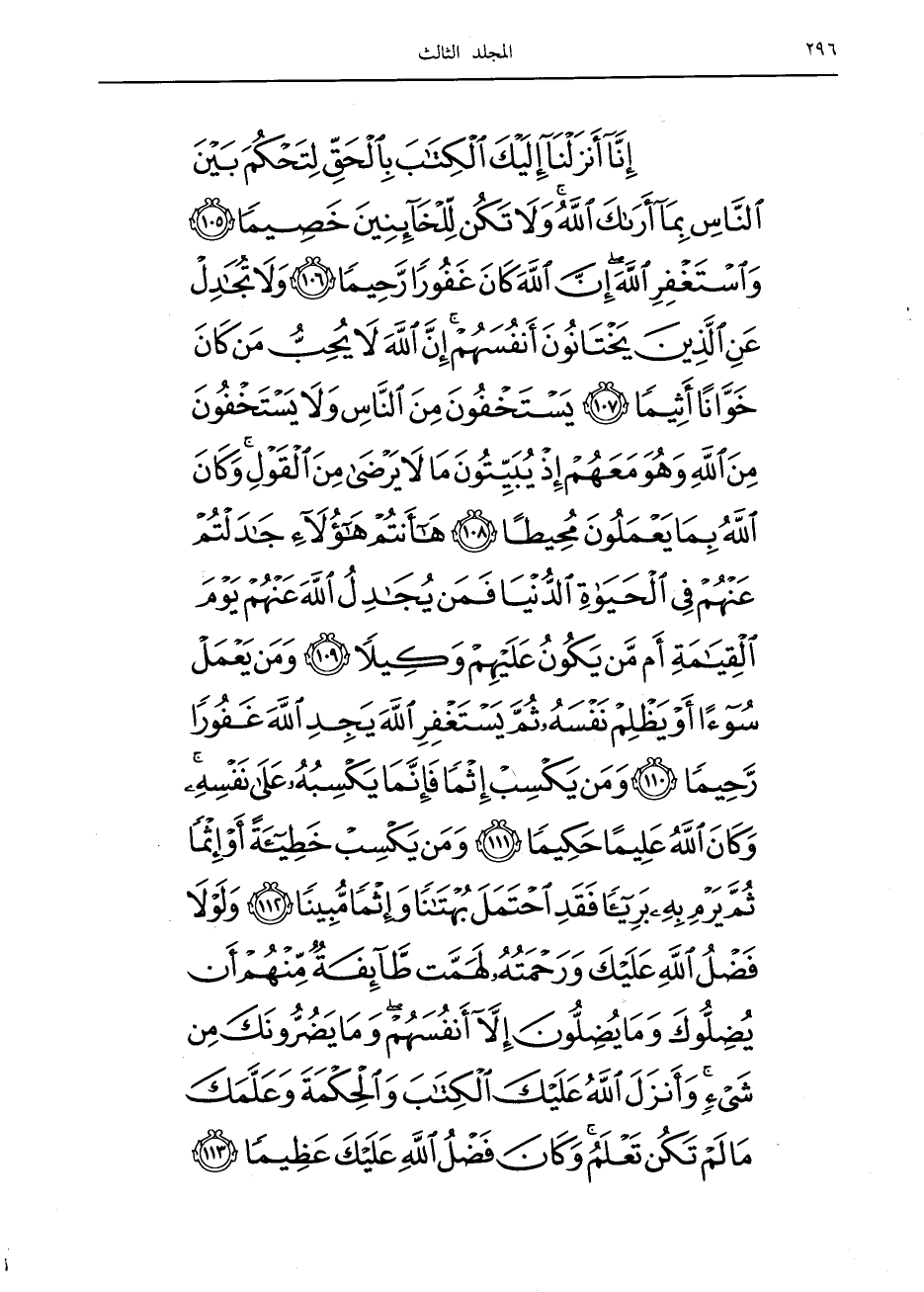 إِنَّا أَنْزَلْنا إِلَيْكَ الْكِتابَ بِالْحَقِّ لِتَحْكُمَ بَيْنَ النَّاسِ بِما أَراكَ اللَّهُ وَلا تَكُنْ لِلْخائِنِينَ خَصِيماً (105) وَاسْتَغْفِرِ اللَّهَ إِنَّ اللَّهَ كانَ غَفُوراً رَحِيماً (106) وَلا تُجادِلْ عَنِ الَّذِينَ يَخْتانُونَ أَنْفُسَهُمْ إِنَّ اللَّهَ لا يُحِبُّ مَنْ كانَ خَوَّاناً أَثِيماً (107) يَسْتَخْفُونَ مِنَ النَّاسِ وَلا يَسْتَخْفُونَ مِنَ اللَّهِ وَهُوَ مَعَهُمْ إِذْ يُبَيِّتُونَ ما لا يَرْضى مِنَ الْقَوْلِ وَكانَ اللَّهُ بِما يَعْمَلُونَ مُحِيطاً (108) ها أَنْتُمْ هؤُلاءِ جادَلْتُمْ عَنْهُمْ فِي الْحَياةِ الدُّنْيا فَمَنْ يُجادِلُ اللَّهَ عَنْهُمْ يَوْمَ الْقِيامَةِ أَمْ مَنْ يَكُونُ عَلَيْهِمْ وَكِيلاً (109)