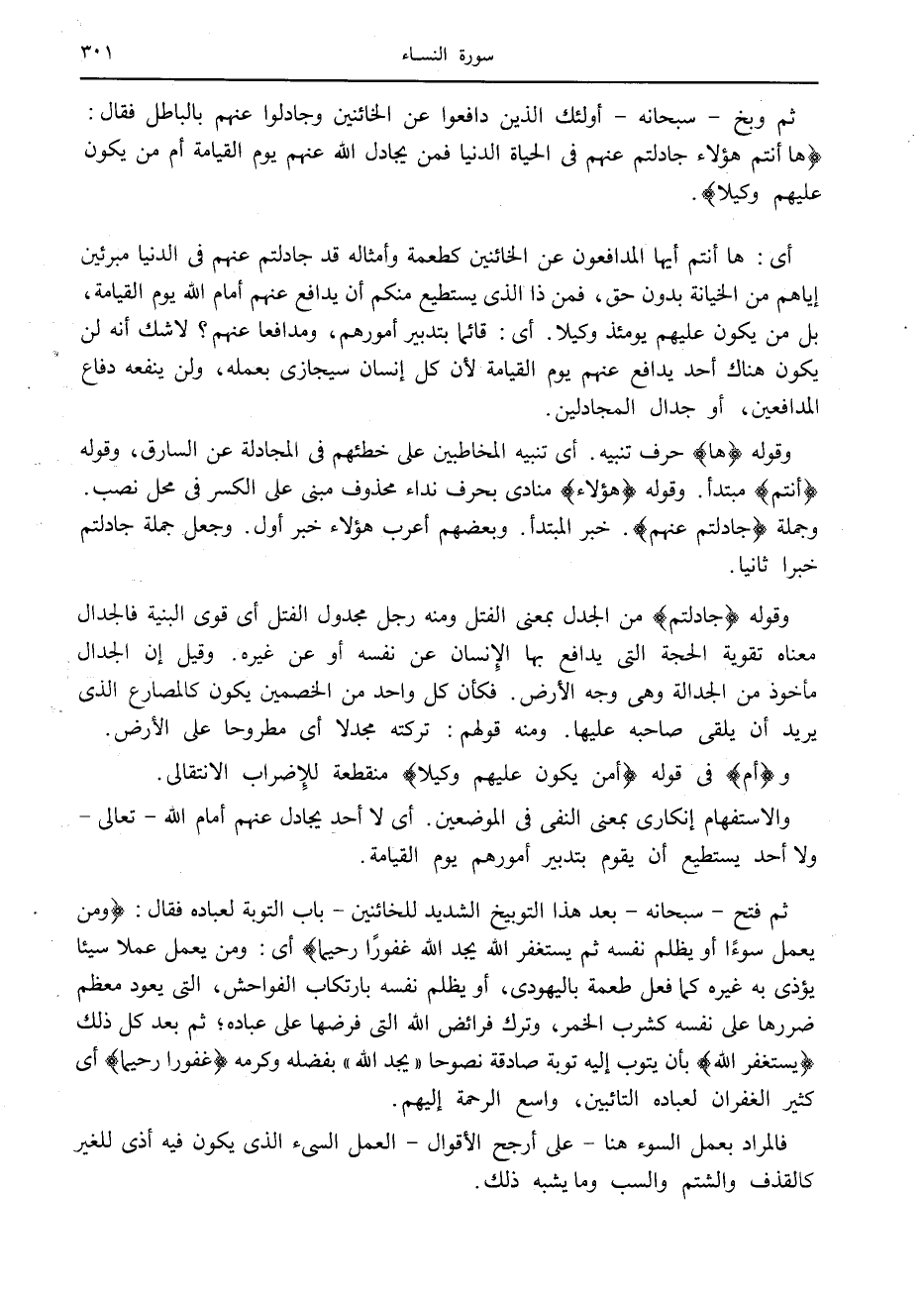 ها أَنْتُمْ هؤُلاءِ جادَلْتُمْ عَنْهُمْ فِي الْحَياةِ الدُّنْيا فَمَنْ يُجادِلُ اللَّهَ عَنْهُمْ يَوْمَ الْقِيامَةِ أَمْ مَنْ يَكُونُ عَلَيْهِمْ وَكِيلًا.