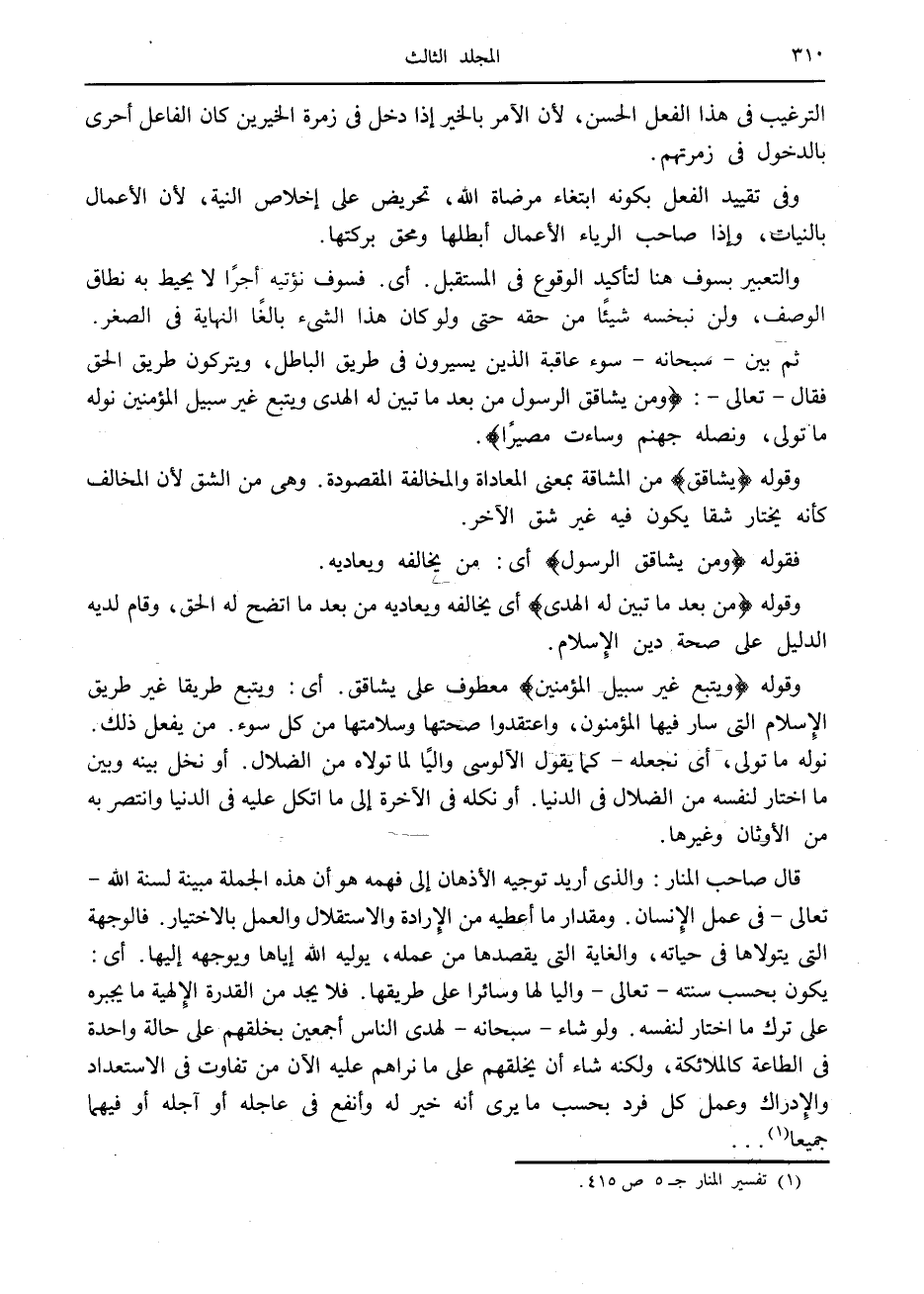 قال صاحب المنار: والذي أريد توجيه الأذهان إلى فهمه هو أن هذه الجملة مبينة لسنة الله- تعالى- في عمل الإنسان. ومقدار ما أعطيه من الإرادة والاستقلال والعمل بالاختيار. فالوجهة التي يتولاها في حياته، والغاية التي يقصدها من عمله، يوليه الله إياها ويوجهه إليها. أى: