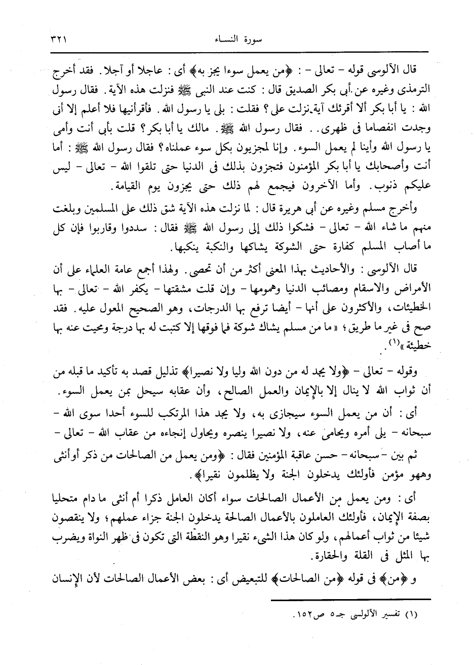 قال الآلوسى قوله- تعالى-: مَنْ يَعْمَلْ سُوءاً يُجْزَ بِهِ أى: عاجلا أو آجلا. فقد أخرج الترمذي وغيره عن أبى بكر الصديق قال: كنت عند النبي صلى الله عليه وسلم فنزلت هذه الآية. فقال رسول الله: يا أبا بكر ألا أقرئك آية نزلت على؟ فقلت: بلى يا رسول الله. فأقرأنيها فلا أعلم إلا أنى وجدت انفصاما في ظهري.. فقال رسول الله صلى الله عليه وسلم. مالك يا أبا بكر؟ قلت بأبى أنت وأمى يا رسول الله وأينا لم يعمل السوء. وإنا لمجزيون بكل سوء عملناه؟ فقال رسول الله صلى الله عليه وسلم: أما أنت وأصحابك يا أبا بكر المؤمنون فتجزون بذلك في الدنيا حتى تلقوا الله- تعالى- ليس عليكم ذنوب. وأما الآخرون فيجمع لهم ذلك حتى يجزون يوم القيامة.