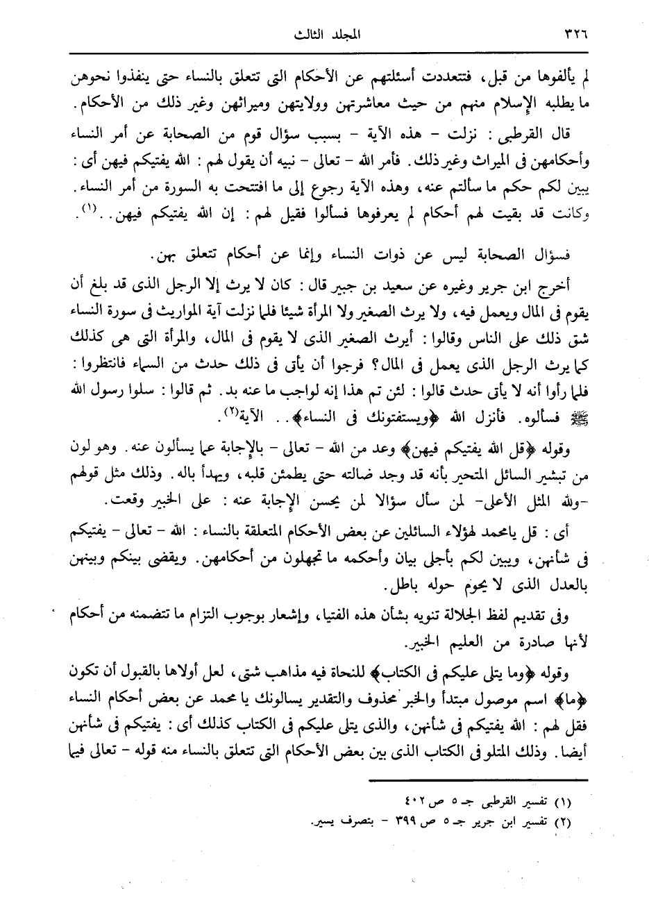 وكانت قد بقيت لهم أحكام لم يعرفوها فسألوا فقيل لهم: إن الله يفتيكم فيهن.. «1» .