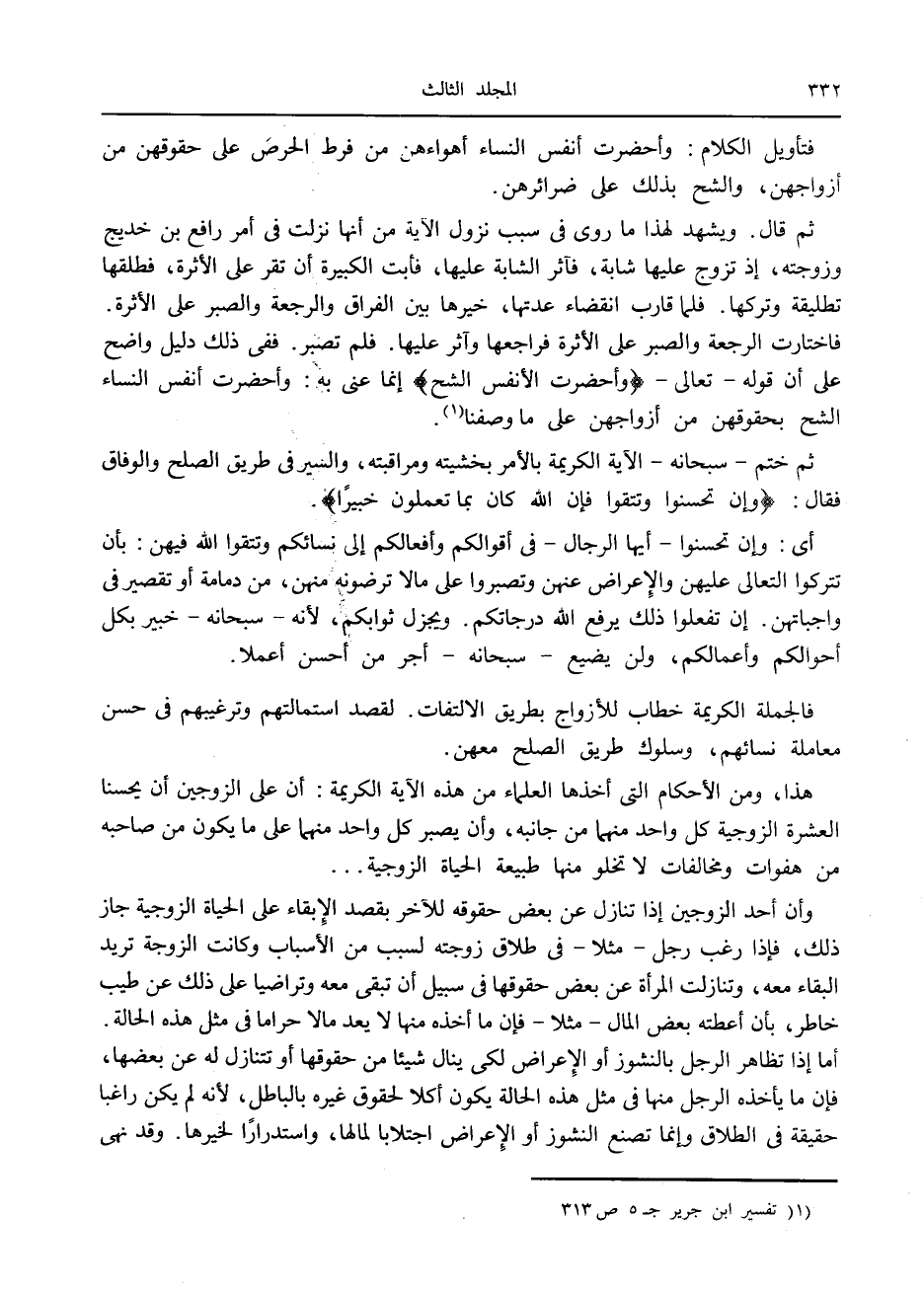 فاختارت الرجعة والصبر على الأثرة فراجعها وآثر عليها. فلم تصبر. ففي ذلك دليل واضح على أن قوله- تعالى- وَأُحْضِرَتِ الْأَنْفُسُ الشُّحَّ إنما عنى به: وأحضرت أنفس النساء الشح بحقوقهن من أزواجهن على ما وصفنا «1» .