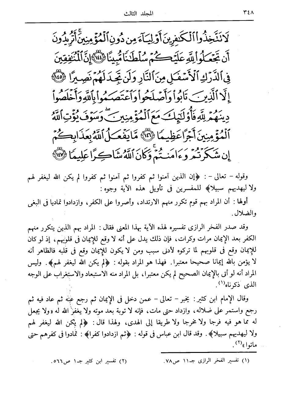 وقد صدر الفخر الرازي تفسيره لهذه الآية بهذا المعنى فقال: المراد بهم الذين يتكرر منهم الكفر بعد الإيمان مرات وكرات، فإن ذلك يدل على أنه لا وقع للإيمان في قلوبهم، إذ لو كان للإيمان وقع في قلوبهم لما تركوه لأدنى سبب ومن لا يكون للإيمان وقع في قلبه فالظاهر أنه لا يؤمن بالله إيمانا صحيحا معتبرا. فهذا هو المراد بقوله: لَمْ يَكُنِ اللَّهُ لِيَغْفِرَ لَهُمْ. وليس المراد أنه لو أتى بالإيمان الصحيح لم يكن معتبرا، بل المراد منه الاستبعاد والاستغراب على الوجه الذي ذكرناه «1» .