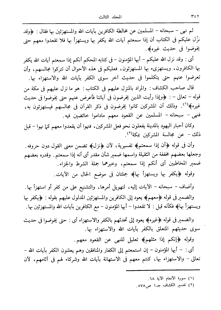 قال صاحب الكشاف: والمراد بالمنزل عليهم في الكتاب: هو ما نزل عليهم في مكة من قوله- تعالى-: وَإِذا رَأَيْتَ الَّذِينَ يَخُوضُونَ فِي آياتِنا فَأَعْرِضْ عَنْهُمْ حَتَّى يَخُوضُوا فِي حَدِيثٍ غَيْرِهِ «1» . وذلك أن المشركين كانوا يخوضون في ذكر القرآن في مجالسهم فيستهزءون به، فنهى- سبحانه- المسلمين عن القعود معهم ماداموا خائضين فيه.