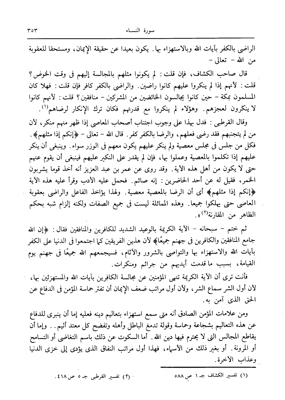 الراضي بالكفر بآيات الله وبالاستهزاء بها. يكون بعيدا عن حقيقة الإيمان، ومستحقا للعقوبة من الله- تعالى- قال صاحب الكشاف، فإن قلت: لم يكونون مثلهم بالمجالسة إليهم في وقت الخوض؟