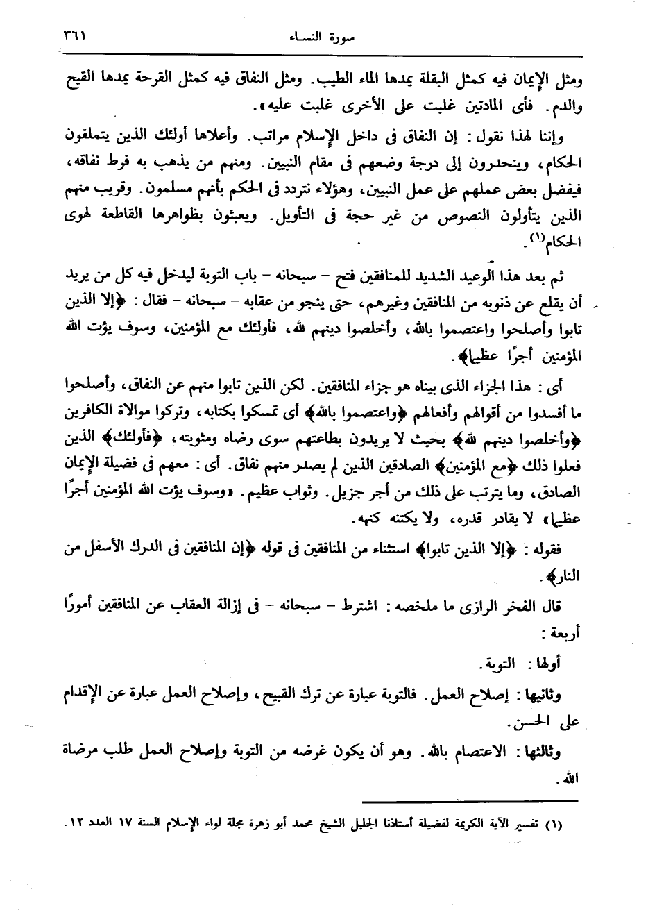 قال الفخر الرازي ما ملخصه: اشترط- سبحانه- في إزالة العقاب عن المنافقين أمورا أربعة: