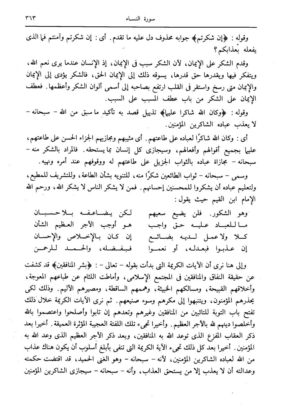 وإلى هنا نرى أن الآيات الكريمة التي بدأت بقوله- تعالى-: بَشِّرِ الْمُنافِقِينَ قد كشفت عن حقيقة النفاق والمنافقين في المجتمع الإسلامى، وأماطت اللثام عن طباعهم المعوجة، وأخلاقهم القبيحة، ومسالكهم الخبيثة، وهممهم الساقطة، ومصيرهم الأليم. وذلك لكي يحذرهم المؤمنون، ويتنبهوا إلى مكرهم وسوء صنيعهم. ثم نرى الآيات الكريمة خلال ذلك تفتح باب التوبة للتائبين من المنافقين وغيرهم وتعدهم إن تابوا وأصلحوا واعتصموا بالله وأخلصوا دينهم لله بالأجر العظيم. وأخيرا تجيء تلك اللفتة العجيبة المؤثرة العميقة. أخيرا بعد ذكر العقاب المفزع الذي توعد الله به المنافقين، وبعد ذكر الأجر العظيم الذي وعد الله به المؤمنين. أخيرا بعد كل ذلك تجيء الآية الكريمة التي تنفى بأبلغ أسلوب أن يكون هناك عذاب من الله لعباده الشاكرين المؤمنين، لأنه- سبحانه- وهو الغنى الحميد، قد اقتضت حكمته وعدالته أن لا يعذب إلا من يستحق العذاب، وأنه- سبحانه- سيجازى الشاكرين المؤمنين