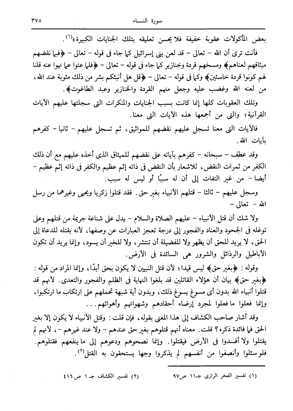 وقد أشار صاحب الكشاف إلى هذا المعنى بقوله، فإن قلت: وقتل الأنبياء لا يكون إلا بغير الحق فما فائدة ذكره؟ قلت. معناه أنهم قتلوهم بغير حق عندهم- ولا عند غيرهم-، لأنهم لم يقتلوا ولا أفسدوا في الأرض فيقتلوا. وإنما نصحوهم ودعوهم إلى ما ينفعهم فقتلوهم.
