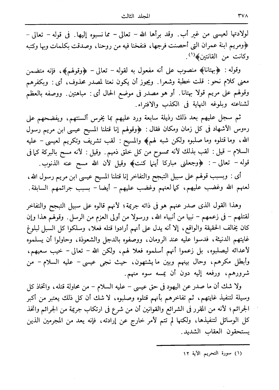 لولادتها لعيسى من غير أب. وقد برأها الله- تعالى- مما نسبوه إليها. في قوله- تعالى- وَمَرْيَمَ ابْنَتَ عِمْرانَ الَّتِي أَحْصَنَتْ فَرْجَها، فَنَفَخْنا فِيهِ مِنْ رُوحِنا، وَصَدَّقَتْ بِكَلِماتِ رَبِّها وَكُتُبِهِ وَكانَتْ مِنَ الْقانِتِينَ «1» .